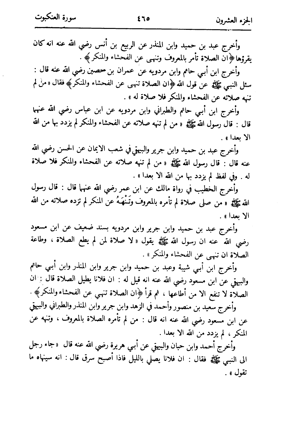 وَأخرج ابْن أبي حَاتِم وَابْن مرْدَوَيْه عَن عمرَان بن حُصَيْن رَضِي الله عَنهُ قَالَ: سُئِلَ النَّبِي صلى الله عَلَيْهِ وَسلم عَن قَول الله {إِن الصَّلَاة تنْهى عَن الْفَحْشَاء وَالْمُنكر} فَقَالَ من لم تَنْهَهُ صلَاته عَن الْفَحْشَاء وَالْمُنكر فَلَا صَلَاة لَهُ