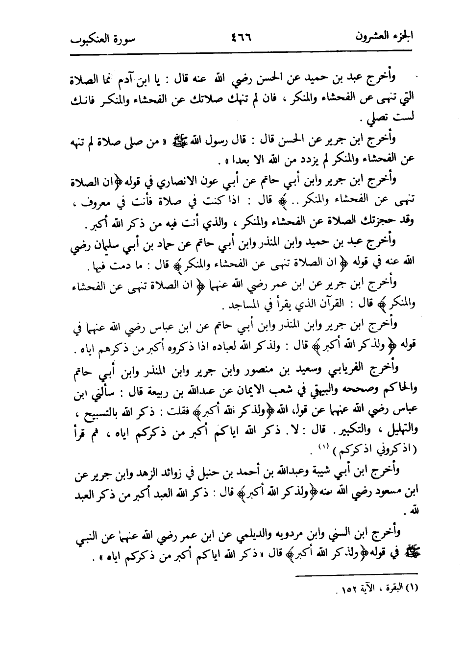وَأخرج ابْن جرير عَن ابْن عمر رَضِي الله عَنْهُمَا {إِن الصَّلَاة تنْهى عَن الْفَحْشَاء وَالْمُنكر} قَالَ: الْقُرْآن الَّذِي يقْرَأ فِي الْمَسَاجِد