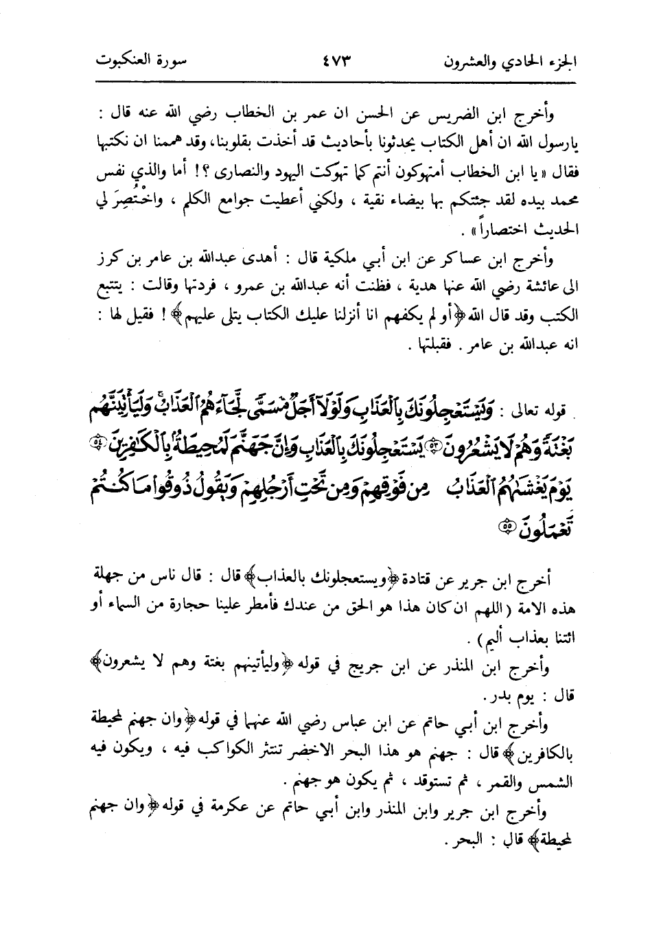 - قَوْله تَعَالَى: ويستعجلونك بِالْعَذَابِ وَلَوْلَا أجل مُسَمّى لجاءهم الْعَذَاب وليأتينهم بَغْتَة وهم لَا يَشْعُرُونَ يستعجلونك بِالْعَذَابِ وَإِن جَهَنَّم لمحيطة بالكافرين يَوْم يَغْشَاهُم الْعَذَاب من فَوْقهم وَمن تَحت أَرجُلهم وَيَقُول ذوقوا مَا كُنْتُم تَعْمَلُونَ