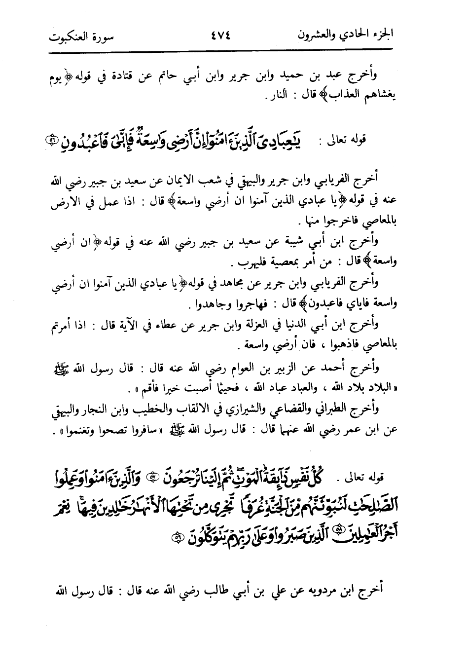 - أخرج الْفرْيَابِيّ وَابْن جرير وَالْبَيْهَقِيّ فِي شعب الإِيمان عَن سعيد بن جُبَير رَضِي الله عَنهُ فِي قَوْله {يَا عبَادي الَّذين آمنُوا إِن أرضي وَاسِعَة} قَالَ: إِذا عمل فِي الأَرْض بِالْمَعَاصِي فأخرجوا مِنْهَا