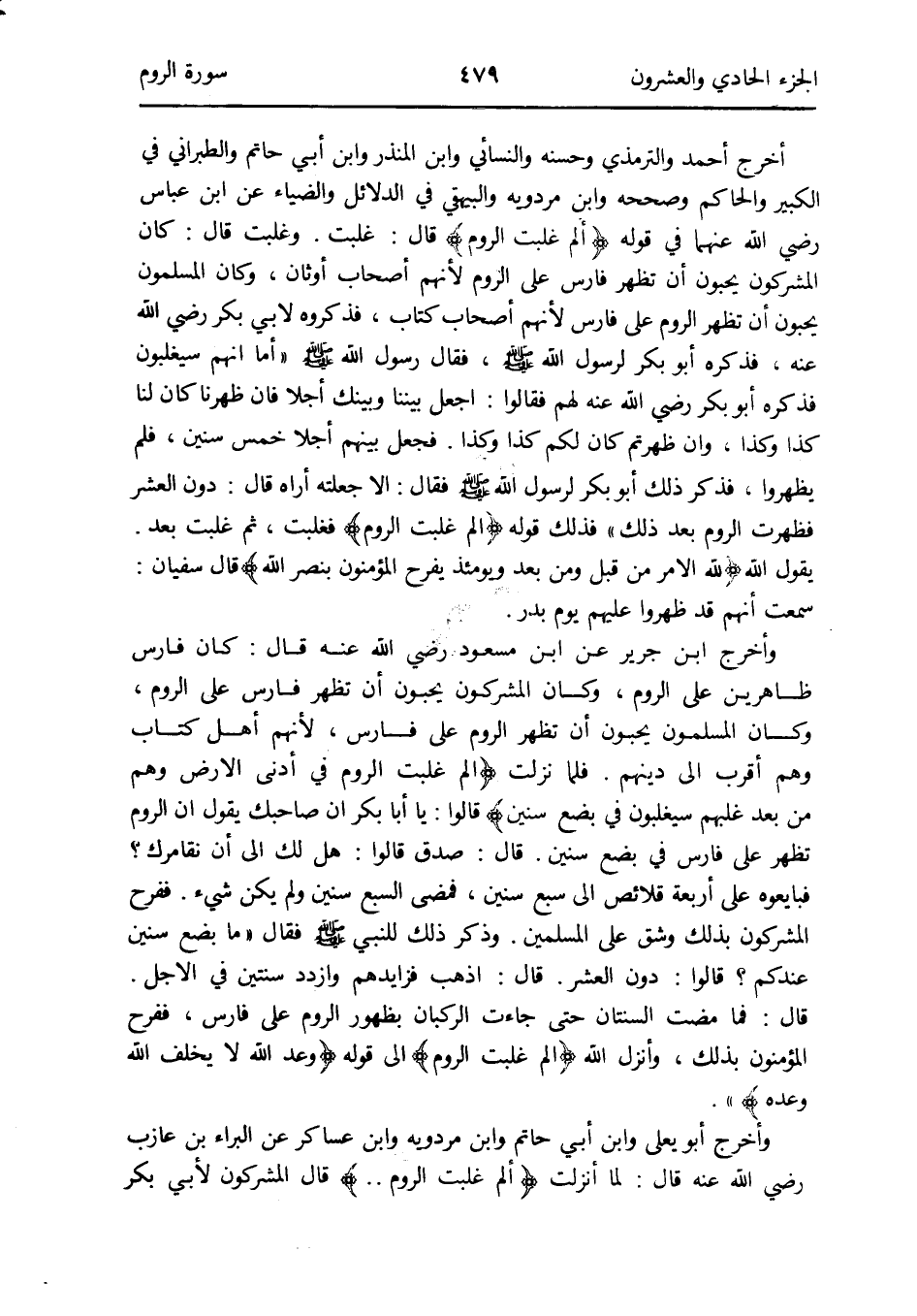 أخرج أَحْمد وَالتِّرْمِذِيّ وَحسنه وَالنَّسَائِيّ وَابْن الْمُنْذر وَابْن أبي حَاتِم وَالطَّبَرَانِيّ فِي الْكَبِير وَالْحَاكِم وَصَححهُ وَابْن مرْدَوَيْه وَالْبَيْهَقِيّ فِي الدَّلَائِل والضياء عَن ابْن عَبَّاس رَضِي الله عَنْهُمَا فِي قَوْله {الم غلبت الرّوم} قَالَ: غلبت