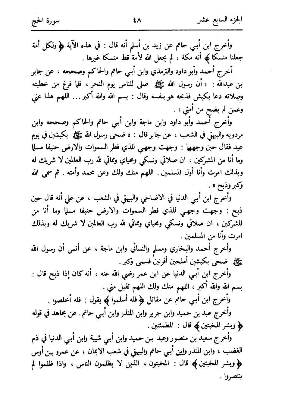 أخرج أَحْمد وَأَبُو دَاوُد وَالتِّرْمِذِيّ وَابْن أبي حَاتِم وَالْحَاكِم وَصَححهُ عَن جَابر بن عبد الله: أَن رَسُول الله صلى الله عَلَيْهِ وَسلم صلى للنَّاس يَوْم النَّحْر فَلَمَّا فرغ من خطبَته وَصلَاته دَعَا بكبش فذبحه هُوَ بِنَفسِهِ وَقَالَ: بِسم الله وَالله أكبر
