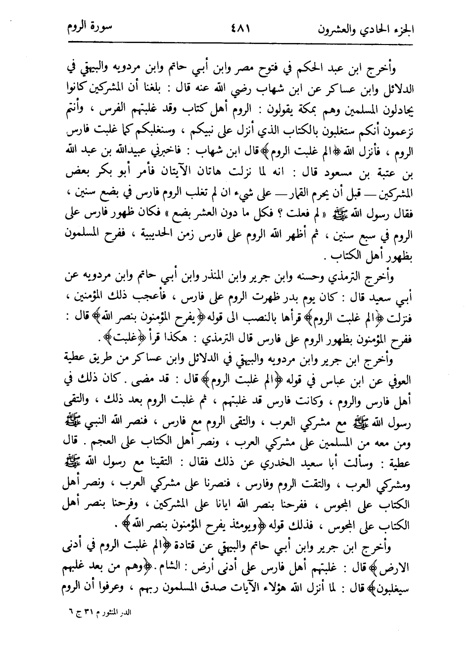 وَأخرج التِّرْمِذِيّ وَحسنه وَابْن جرير وَابْن الْمُنْذر وَابْن أبي حَاتِم وَابْن مرْدَوَيْه عَن أبي سعيد قَالَ: كَانَ يَوْم بدر ظَهرت الرّوم على قارس فأعجب ذَلِك الْمُؤمنِينَ فَنزلت {الم غلبت الرّوم} قَرَأَهَا بِالنّصب إِلَى قَوْله {يفرح الْمُؤْمِنُونَ بنصر الله} قَالَ: ففرح المؤمنو بِظُهُور الرّوم على فَارس قَالَ التِّرْمِذِيّ: هَكَذَا قَرَأَ {غلبت}