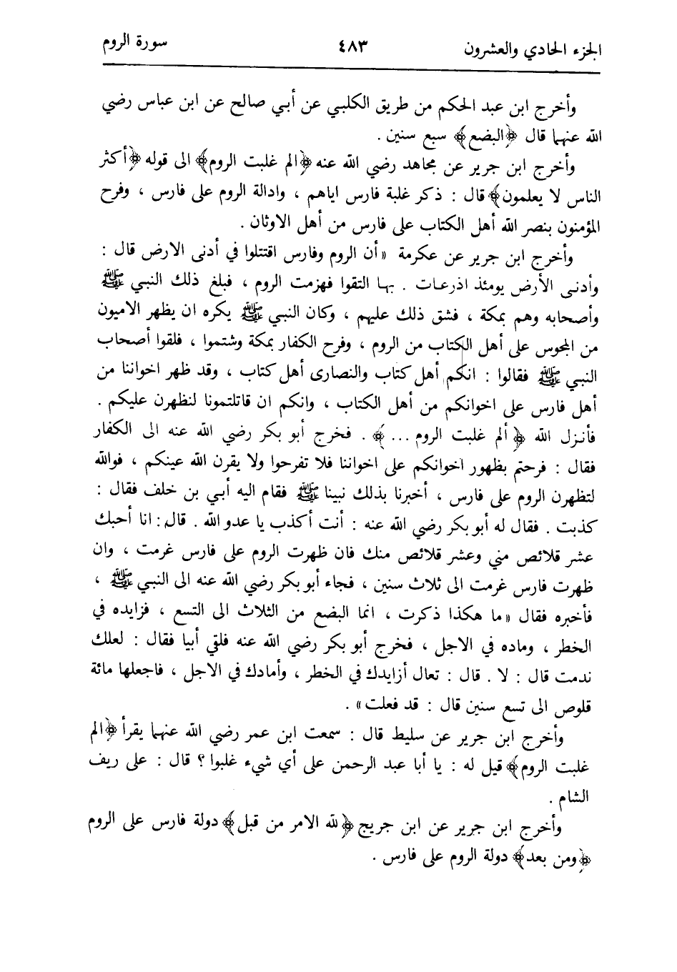 وَأخرج ابْن جرير عَن مُجَاهِد رَضِي الله عَنهُ {الم غلبت الرّوم} إِلَى قَوْله {أَكثر النَّاس لَا يعلمُونَ} قَالَ: ذكر غَلَبَة فَارس اياهم وادالة الرّوم على فَارس وَفَرح الْمُؤْمِنُونَ بنصر الله أهل الْكتاب على فَارس من أهل الْأَوْثَان