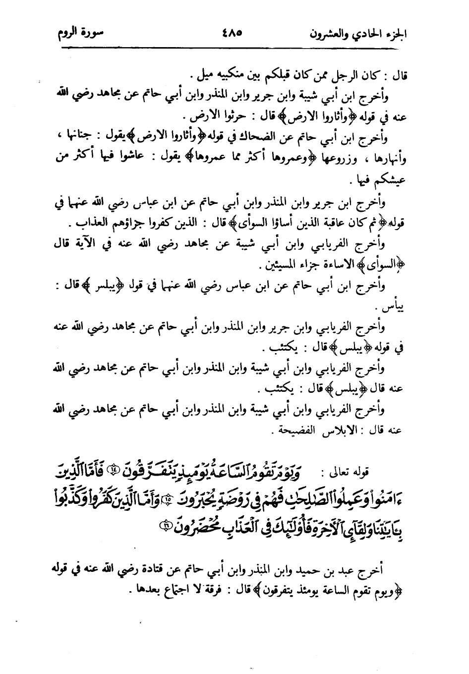 - قَوْله تَعَالَى: وَيَوْم تقوم السَّاعَة يَوْمئِذٍ يتفرقون فَأَما الَّذين آمنُوا وَعمِلُوا الصَّالِحَات فهم فِي رَوْضَة يحبرون وَأما الَّذين كفرُوا وكذبوا بِآيَاتِنَا ولقاء الْآخِرَة فَأُولَئِك فِي الْعَذَاب محضرون