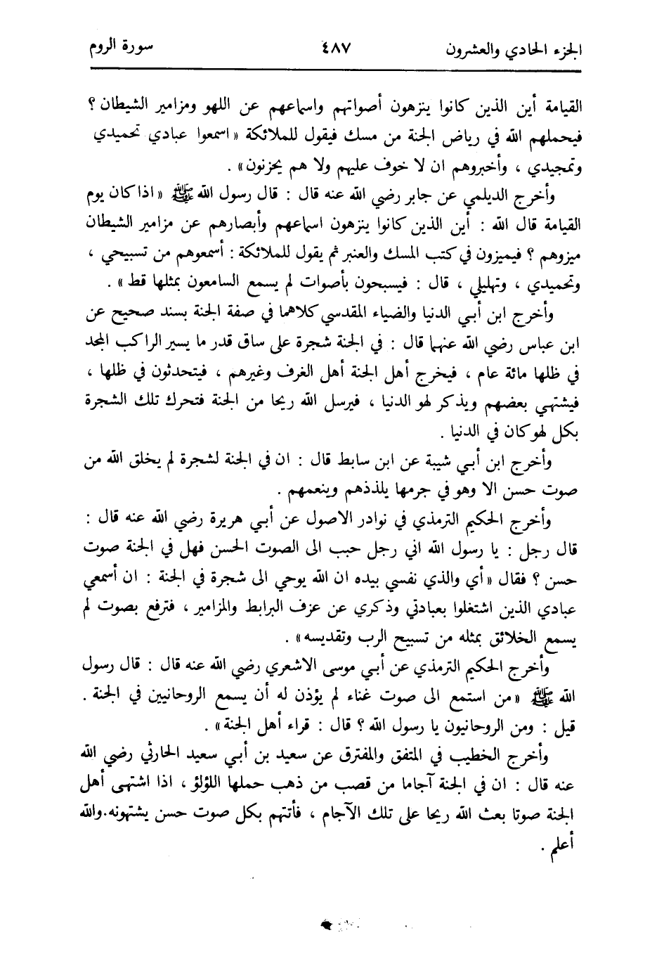 وَأخرج الْحَكِيم التِّرْمِذِيّ فِي نَوَادِر الْأُصُول عَن أبي هُرَيْرَة رَضِي الله عَنهُ قَالَ: قَالَ رجل: يَا رَسُول الله إِنِّي رجل حبب إليّ الصَّوْت الْحسن فَهَل فِي الْجنَّة صَوت حسن فَقَالَ أَي وَالَّذِي نَفسِي بِيَدِهِ إِن الله يوحي إِلَى شَجَرَة فِي الْجنَّة: أَن أسمعي عبَادي الَّذين اشتغلوا بعبادتي وذكري عَن عزف البرابط والمزامير فَترفع بِصَوْت لم يسمع الْخَلَائق بِمثلِهِ من تَسْبِيح الرب وتقديسه