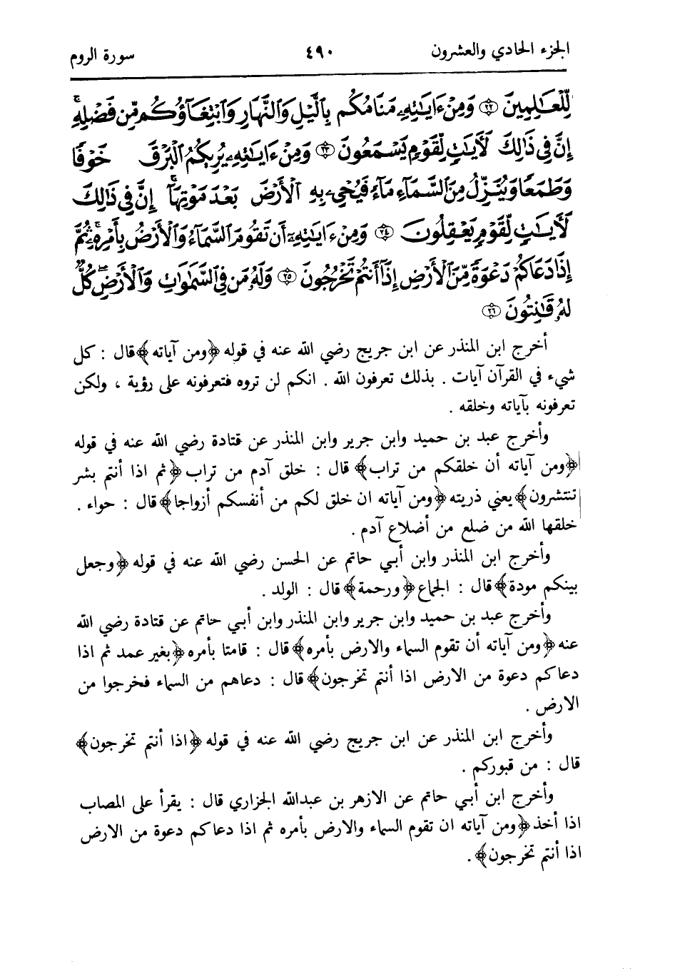 للْعَالمين وَمن آيَاته منامكم بِاللَّيْلِ وَالنَّهَار وابتغاؤكم من فَضله إِن فِي ذَلِك لآيَات لقوم يسمعُونَ وَمن آيَاته يريكم الْبَرْق خوفًا وَطَمَعًا وَينزل من السَّمَاء مَاء فيحيي بِهِ الأَرْض بعد مَوتهَا إِن فِي ذَلِك لآيَات لقوم يعْقلُونَ وَمن آيَاته أَن تقوم السَّمَاء وَالْأَرْض بأَمْره ثمَّ إِذا دعَاكُمْ دَعْوَة من الأَرْض إِذا أَنْتُم تخرجُونَ وَله من فِي السَّمَوَات وَالْأَرْض كل لَهُ قانتون