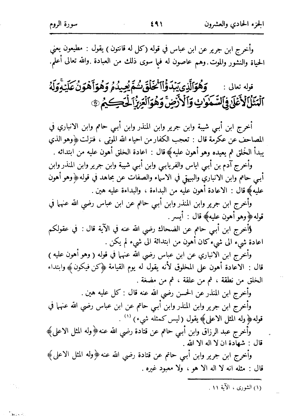 وَأخرج ابْن جرير وَابْن الْمُنْذر وَابْن أبي حَاتِم عَن ابْن عَبَّاس رَضِي الله عَنْهُمَا فِي قَوْله {وَله الْمثل الْأَعْلَى} يَقُول {لَيْسَ كمثله شَيْء} الشورى الْآيَة 11 وَأخرج عبد الرَّزَّاق وَابْن أبي حَاتِم عَن قَتَادَة رَضِي الله عَنهُ {وَله الْمثل الْأَعْلَى} قَالَ: شَهَادَة أَن لَا إِلَه إِلَّا الله