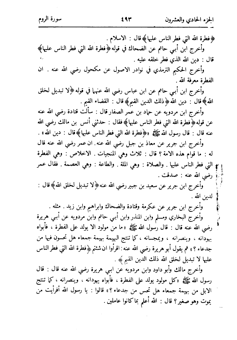 وَأخرج البُخَارِيّ وَمُسلم وَابْن الْمُنْذر وَابْن أبي حَاتِم وَابْن مرْدَوَيْه عَن أبي هُرَيْرَة رَضِي الله عَنهُ قَالَ: قَالَ رَسُول الله صلى الله عَلَيْهِ وَسلم مَا من مَوْلُود إِلَّا يُولد على الْفطْرَة فَأَبَوَاهُ يُهَوِّدَانِهِ وَيُنَصِّرَانِهِ ويمجسانه كَمَا تنْتج الْبَهِيمَة بَهِيمَة جَمْعَاء هَل تُحِسُّونَ فِيهَا من جَدْعَاء ثمَّ يَقُول أَبُو هُرَيْرَة رَضِي الله عَنهُ: اقرأوا ان شِئْتُم {فطْرَة الله الَّتِي فطر النَّاس عَلَيْهَا لَا تَبْدِيل لخلق الله ذَلِك الدّين الْقيم}