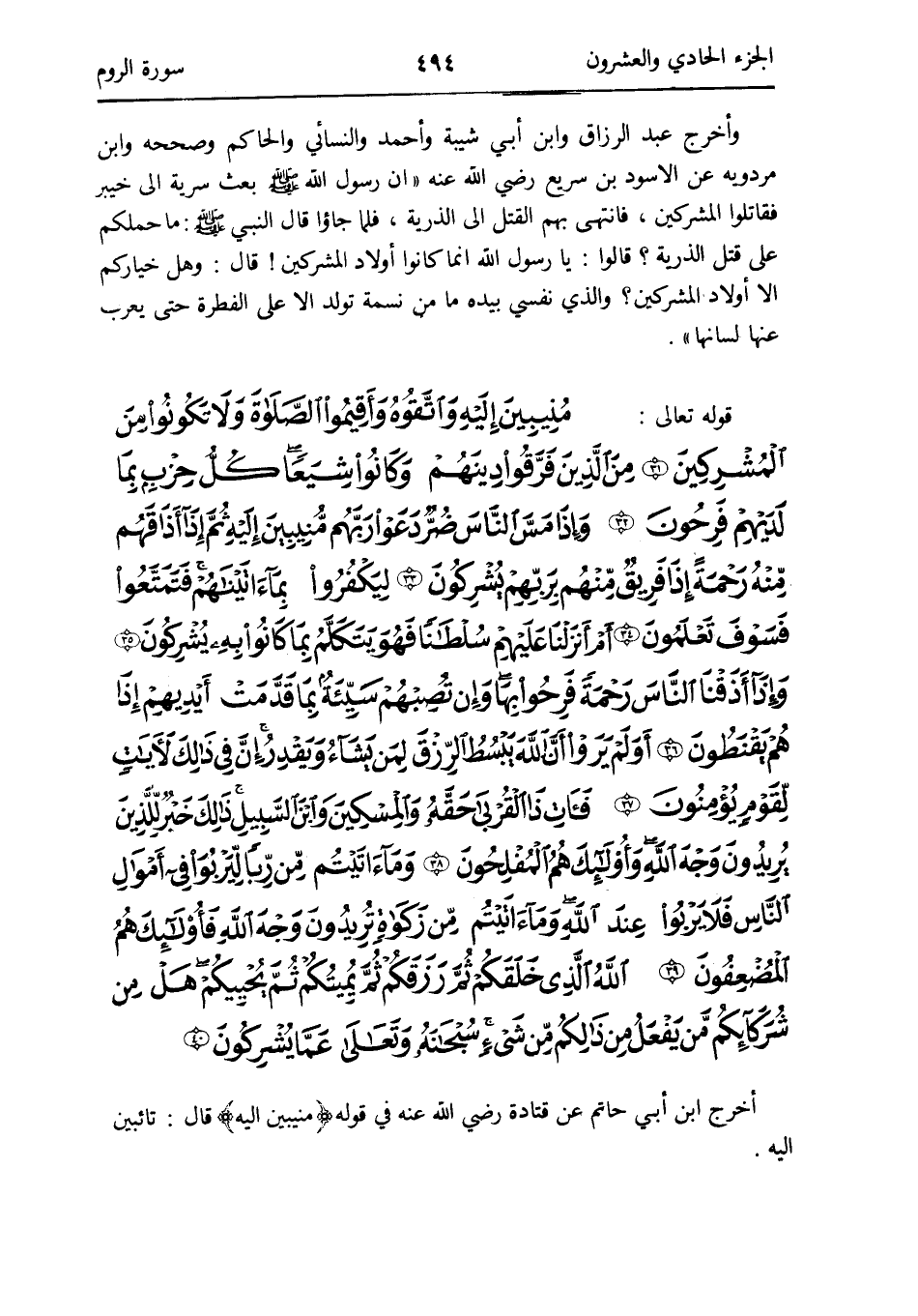 - قَوْله تَعَالَى: منيبين إِلَيْهِ واتقوه وَأقِيمُوا الصَّلَاة وَلَا تَكُونُوا من الْمُشْركين من الَّذين فرقوا دينهم وَكَانُوا شيعًا كل حزب بِمَا لديهم فَرِحُونَ وَإِذا مس النَّاس ضرّ دعوا رَبهم منيبين إِلَيْهِ ثمَّ إِذا أذاقهم مِنْهُ رَحْمَة إِذا فريق مِنْهُم برَبهمْ يشركُونَ ليكفروا بِمَا آتَيْنَاهُم فتمتعوا فَسَوف تعلمُونَ أم أنزلنَا عَلَيْهِم سُلْطَانا فَهُوَ يتَكَلَّم بِمَا كَانُوا بِهِ يشركُونَ وَإِذا أذقنا النَّاس رَحْمَة فرحوا بهَا وَإِن تصبهم سَيِّئَة بِمَا قدمت أَيْديهم إِذا هم يقنطون أولم يرَوا أَن الله يبسط الرزق لمن يَشَاء وَيقدر إِن فِي ذَلِك لآيَات لقوم يُؤمنُونَ فَآت ذَا الْقُرْبَى حَقه والمسكين وَابْن السَّبِيل ذَلِك خير للَّذين يُرِيدُونَ وَجه الله وَأُولَئِكَ هم المفلحون وَمَا آتيتم من رَبًّا ليربوا فِي أَمْوَال النَّاس فَلَا يربوا عِنْد الله وماأتيتم من زَكَاة تُرِيدُونَ وَجه الله فَأُولَئِك هم المضعفون الله الَّذِي خَلقكُم ثمَّ رزقكم ثمَّ يميتكم ثمَّ يُحْيِيكُمْ هَل من شركائكم من يفعل من ذَلِكُم من شَيْء سُبْحَانَهُ وَتَعَالَى عَمَّا يشركُونَ