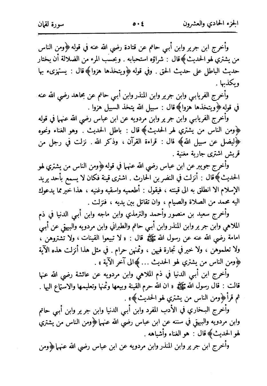 وَأخرج البُخَارِيّ فِي الْأَدَب الْمُفْرد وَابْن أبي الدُّنْيَا وَابْن جرير وَابْن أبي حَاتِم وَابْن مرْدَوَيْه وَالْبَيْهَقِيّ فِي سنَنه عَن ابْن عَبَّاس رَضِي الله عَنْهُمَا {وَمن النَّاس من يَشْتَرِي لَهو الحَدِيث} قَالَ: هُوَ الْغناء وأشباهه