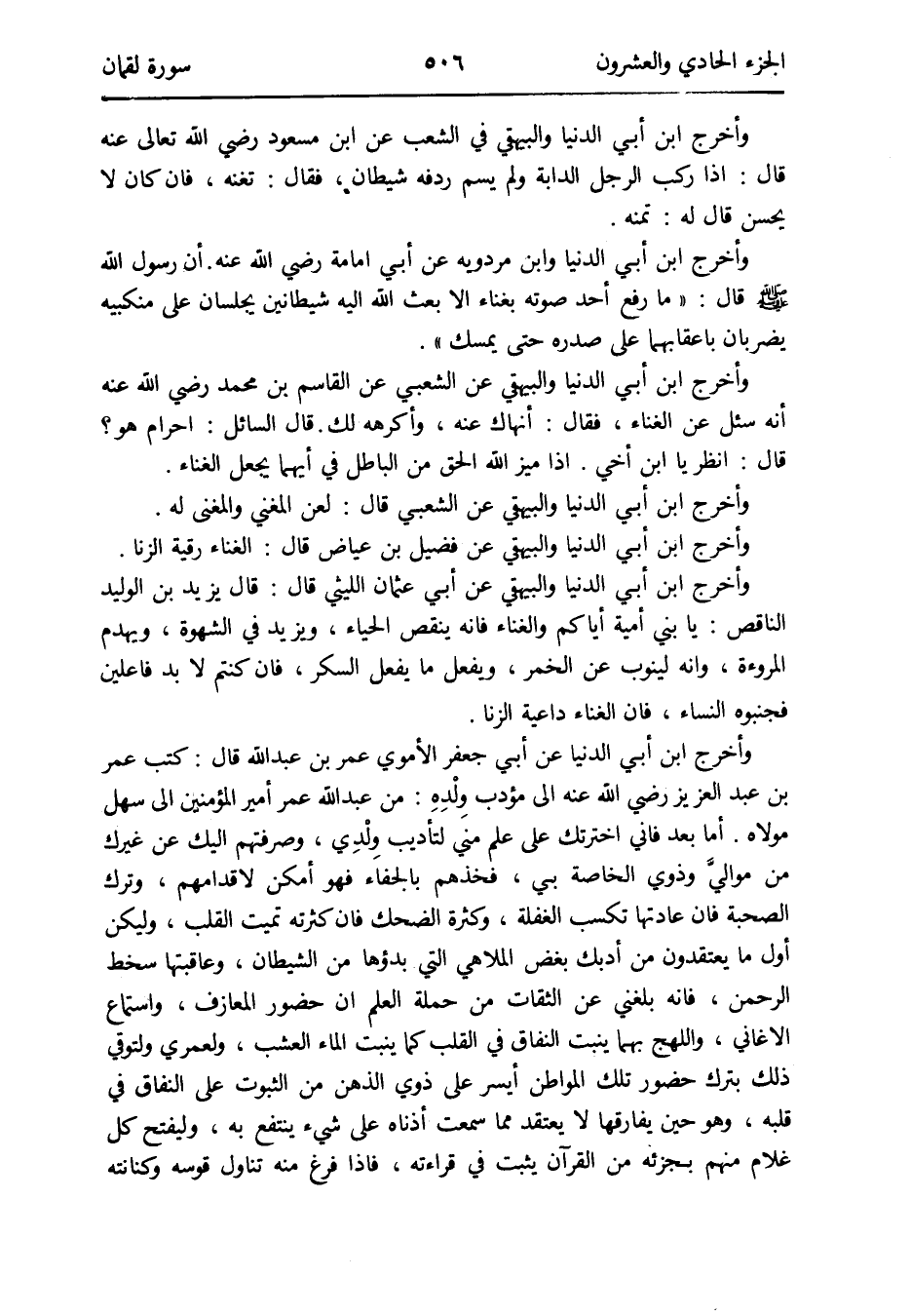 وَأخرج ابْن أبي الدُّنْيَا وَالْبَيْهَقِيّ عَن أبي عُثْمَان اللَّيْثِيّ قَالَ: قَالَ يزِيد بن الْوَلِيد النَّاقِص: يَا بني أُميَّة إيَّاكُمْ والغناء فَإِنَّهُ ينقص الْحيَاء وَيزِيد فِي الشَّهْوَة ويهدم الْمُرُوءَة وَإنَّهُ لينوب عَن الْخمر وَيفْعل مَا يفعل السكر فَإِن كُنْتُم لابد فاعلين فجنبوه النِّسَاء فَإِن الْغناء دَاعِيَة الزِّنَا