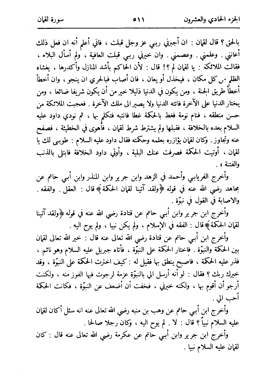 وَأخرج ابْن جرير وَابْن أبي حَاتِم عَن قَتَادَة رَضِي الله عَنهُ فِي قَوْله {وَلَقَد آتَيْنَا لُقْمَان الْحِكْمَة} قَالَ: الْفِقْه فِي الإِسلام وَلم يكن نَبيا وَلم يُوح إِلَيْهِ