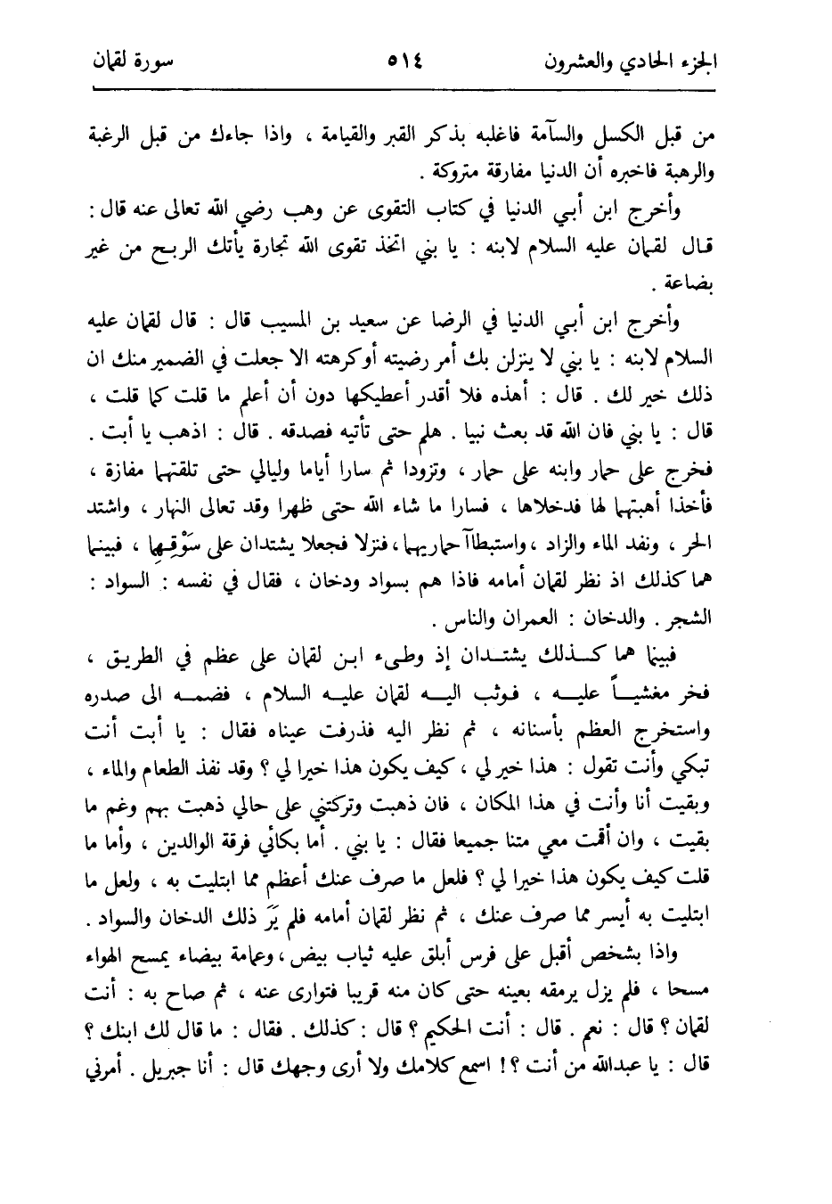 أما بُكَائِي فرقة الْوَالِدين وَأما مَا قلت كَيفَ يكون هَذَا خير لي فَلَعَلَّ مَا صرف عَنْك أعظم مِمَّا ابْتليت بِهِ وَلَعَلَّ مَا ابْتليت بِهِ أيسر مِمَّا صرف عَنْك ثمَّ نظر لُقْمَان أَمَامه فَلم يَرَ ذَلِك الدُّخان والسواد