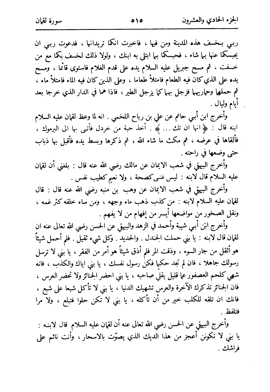 وَأخرج ابْن أبي شيبَة وَأحمد فِي الزّهْد وَالْبَيْهَقِيّ عَن الْحسن رَضِي الله تَعَالَى عَنهُ أَن لُقْمَان قَالَ لِابْنِهِ: يَا بني حملت الجندل