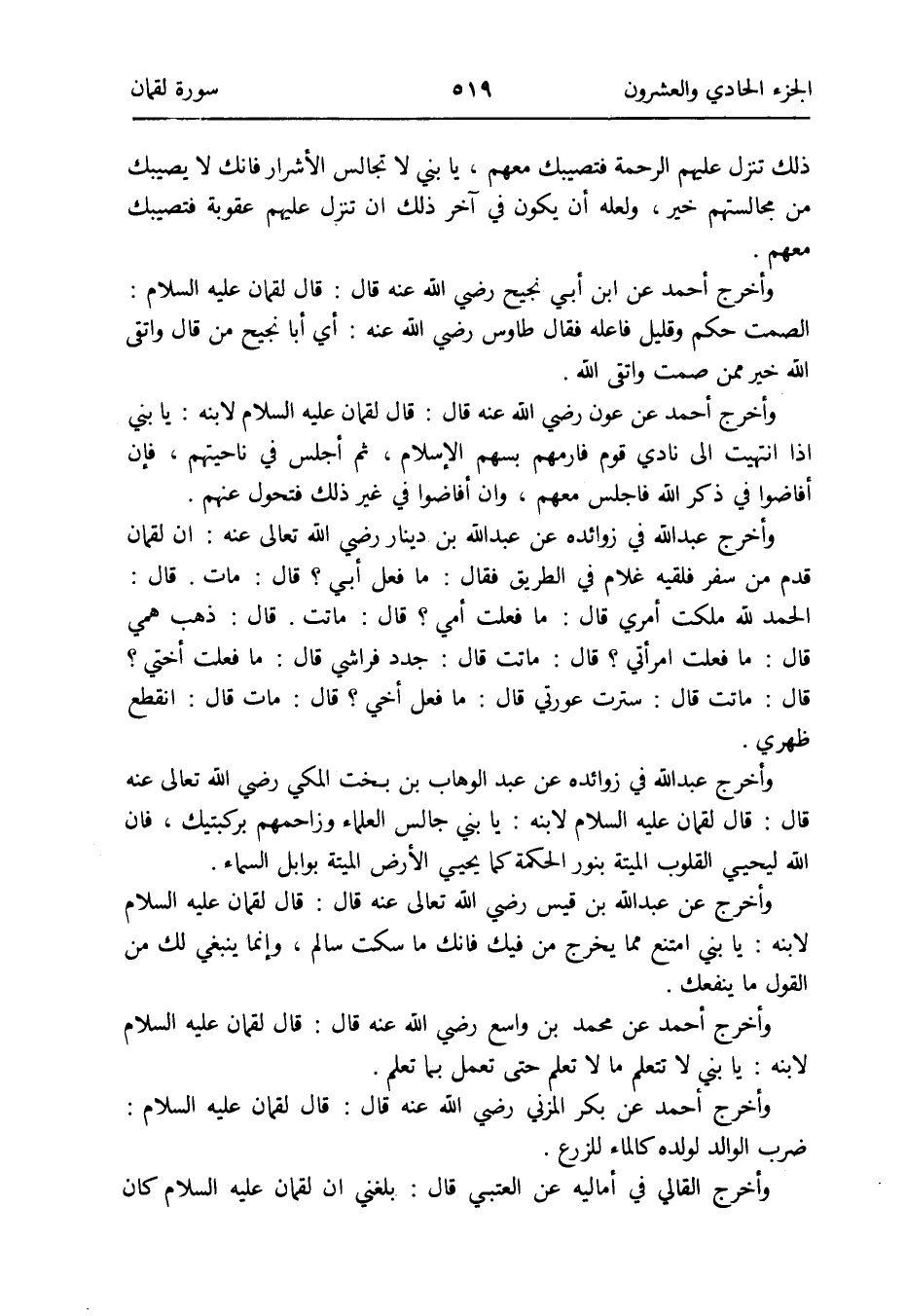 وَأخرج عبد الله فِي زوائده عَن عبد الْوَهَّاب بن بخت الْمَكِّيّ رَضِي الله تَعَالَى عَنهُ قَالَ: قَالَ لُقْمَان عَلَيْهِ السَّلَام لِابْنِهِ: يَا بني جَالس الْعلمَاء وزاحمهم بركبتيك فَإِن الله ليحيي الْقُلُوب الْميتَة بِنور الْحِكْمَة كَمَا يحيي الأَرْض الْميتَة بوابل السَّمَاء