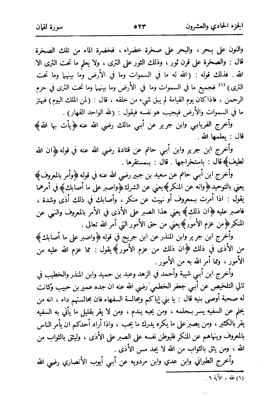 وَأخرج ابْن جرير وَابْن الْمُنْذر عَن ابْن جريج فِي قَوْله {واصبر على مَا أَصَابَك} من الْأَذَى فِي ذَلِك {إِن ذَلِك من عزم الْأُمُور} يَقُول: مِمَّا عزم الله عَلَيْهِ من الْأُمُور وَمِمَّا أَمر الله بِهِ من الْأُمُور