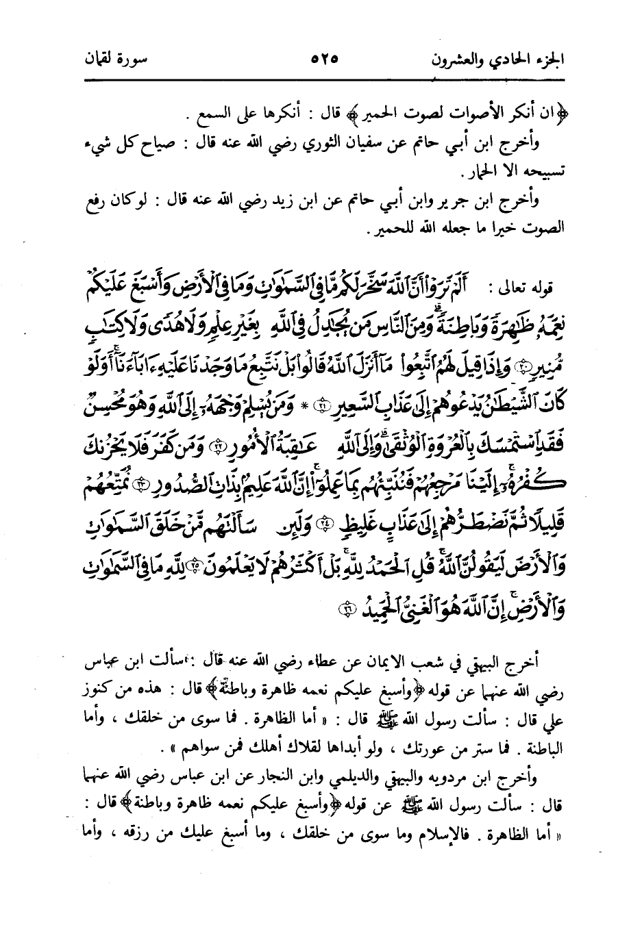 - قَوْله تَعَالَى: ألم تروا أَن الله سخر لكم مَا فِي السَّمَوَات وَمَا فِي الأَرْض وأسبغ عَلَيْكُم نعمه ظَاهِرَة وباطنة وَمن النَّاس من يُجَادِل فِي الله بِغَيْر علم وَلَا هدى وَلَا كتاب مُنِير وَإِذا قيل لَهُم اتبعُوا مَا أنزل الله قَالُوا بل نتبع مَا وجدنَا عَلَيْهِ آبَاءَنَا أولو كَانَ الشَّيْطَان يَدعُوهُم إِلَى عَذَاب السعير وَمن يسلم وَجهه إِلَى الله وَهُوَ محسن فقد استمسك بالعروة الوثقى وَإِلَى الله عَاقِبَة الْأُمُور وَمن كفر فَلَا يحزنك كفره إِلَيْنَا مرجعهم فننبئهم بِمَا عمِلُوا إِن الله عليم بِذَات الصُّدُور نمتعهم قَلِيلا ثمَّ نضطرهم إِلَى عَذَاب غليظ وَلَئِن سَأَلتهمْ من خلق السَّمَوَات وَالْأَرْض ليَقُولن الله قل الْحَمد لله بل أَكْثَرهم لَا يعلمُونَ لله مَا فِي السَّمَوَات وَالْأَرْض إِن الله هُوَ الْغَنِيّ الحميد
