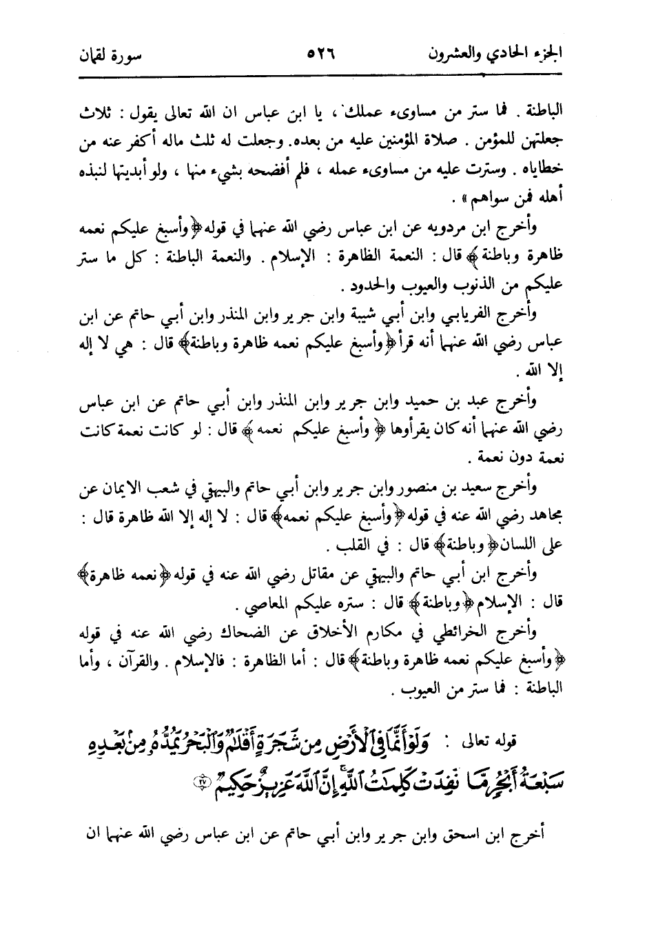 وَأخرج الْفرْيَابِيّ وَابْن أبي شيبَة وَابْن جرير وَابْن الْمُنْذر وَابْن أبي حَاتِم عَن ابْن عَبَّاس رَضِي الله عَنْهُمَا أَنه قَرَأَ {وأسبغ عَلَيْكُم نعمه ظَاهِرَة وباطنة} قَالَ: هِيَ لَا إِلَه إِلَّا الله