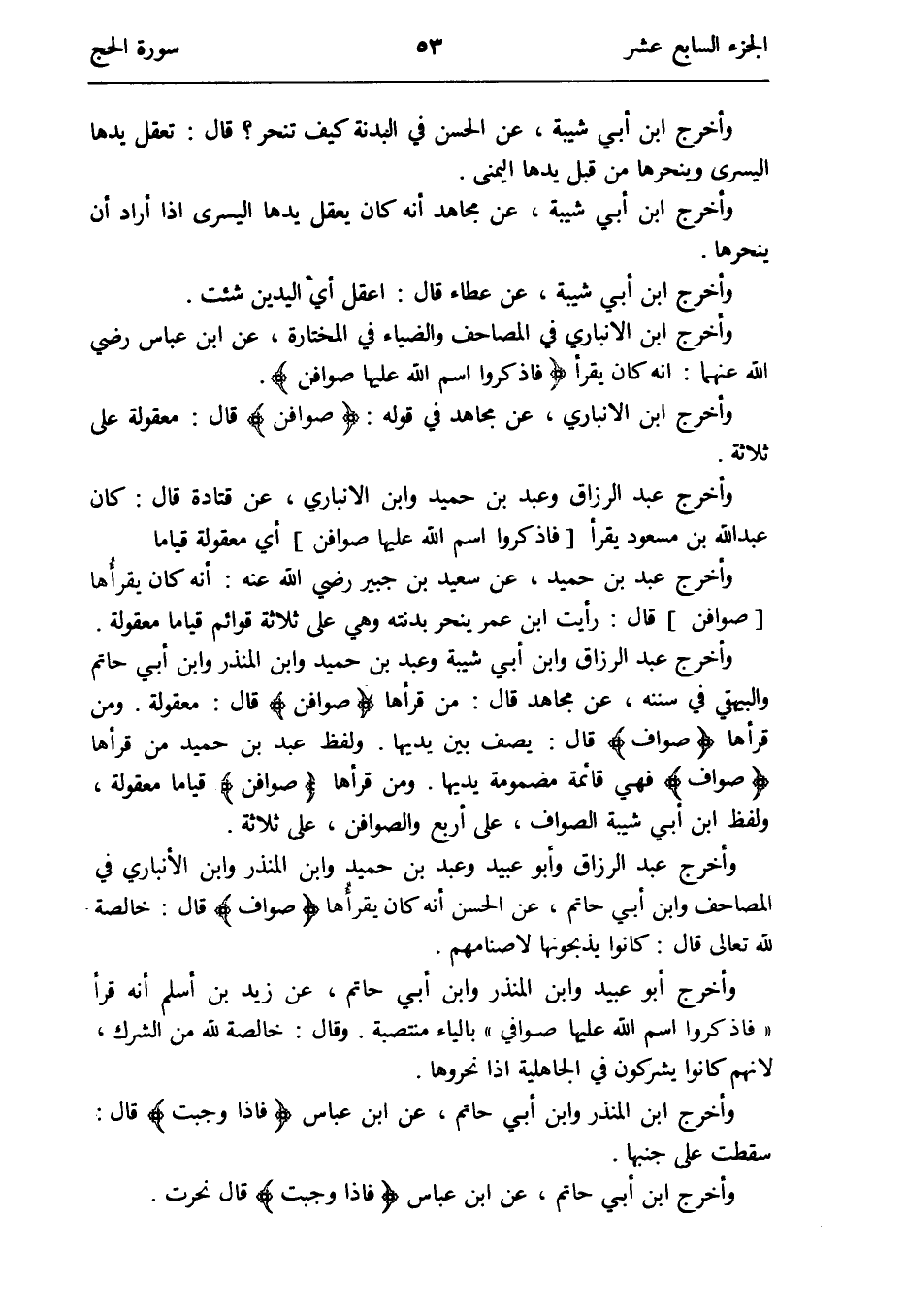 وَأخرج أَبُو عبيد وَابْن الْمُنْذر وَابْن أبي حَاتِم عَن زيد بن أسلم أَنه قَرَأَ (فاذكروا اسْم الله عَلَيْهَا صوافي) بِالْيَاءِ منتصبة