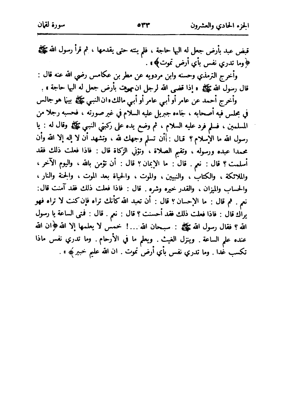 وَأخرج أَحْمد عَن عَامر أَو أبي مَالك أَن النَّبِي صلى الله عَلَيْهِ وَسلم بَيْنَمَا هُوَ جَالس فِي مَجْلِسه فِيهِ أَصْحَابه جَاءَهُ جِبْرِيل عَلَيْهِ السَّلَام فِي غير صورته فحسبه رجلا من الْمُسلمين فَسلم فَرد عَلَيْهِ السَّلَام ثمَّ وضع يَده على ركبتي النَّبِي صلى الله عَلَيْهِ وَسلم وَقَالَ لَهُ: يَا رَسُول الله مَا الإِسلام قَالَ: أَن تسلم وَجهك لله وَتشهد أَن لَا إِلَه إِلَّا الله وَأَن مُحَمَّدًا عَبده وَرَسُوله وتقيم الصَّلَاة وتؤتي الزَّكَاة قَالَ: فَإِذا فعلت ذَلِك فقد أسلمت قَالَ: نعم