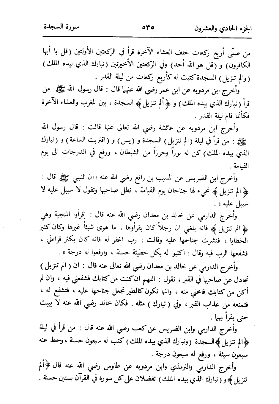 وَأخرج الدَّارمِيّ وَابْن ضريس عَن كَعْب رَضِي الله عَنهُ قَالَ: من قَرَأَ فِي لَيْلَة {الم تَنْزِيل} السَّجْدَة {تبَارك الَّذِي بِيَدِهِ الْملك} كتب لَهُ سَبْعُونَ حَسَنَة وَحط عَنهُ سَبْعُونَ سَيِّئَة وَرفع لَهُ سَبْعُونَ دَرَجَة