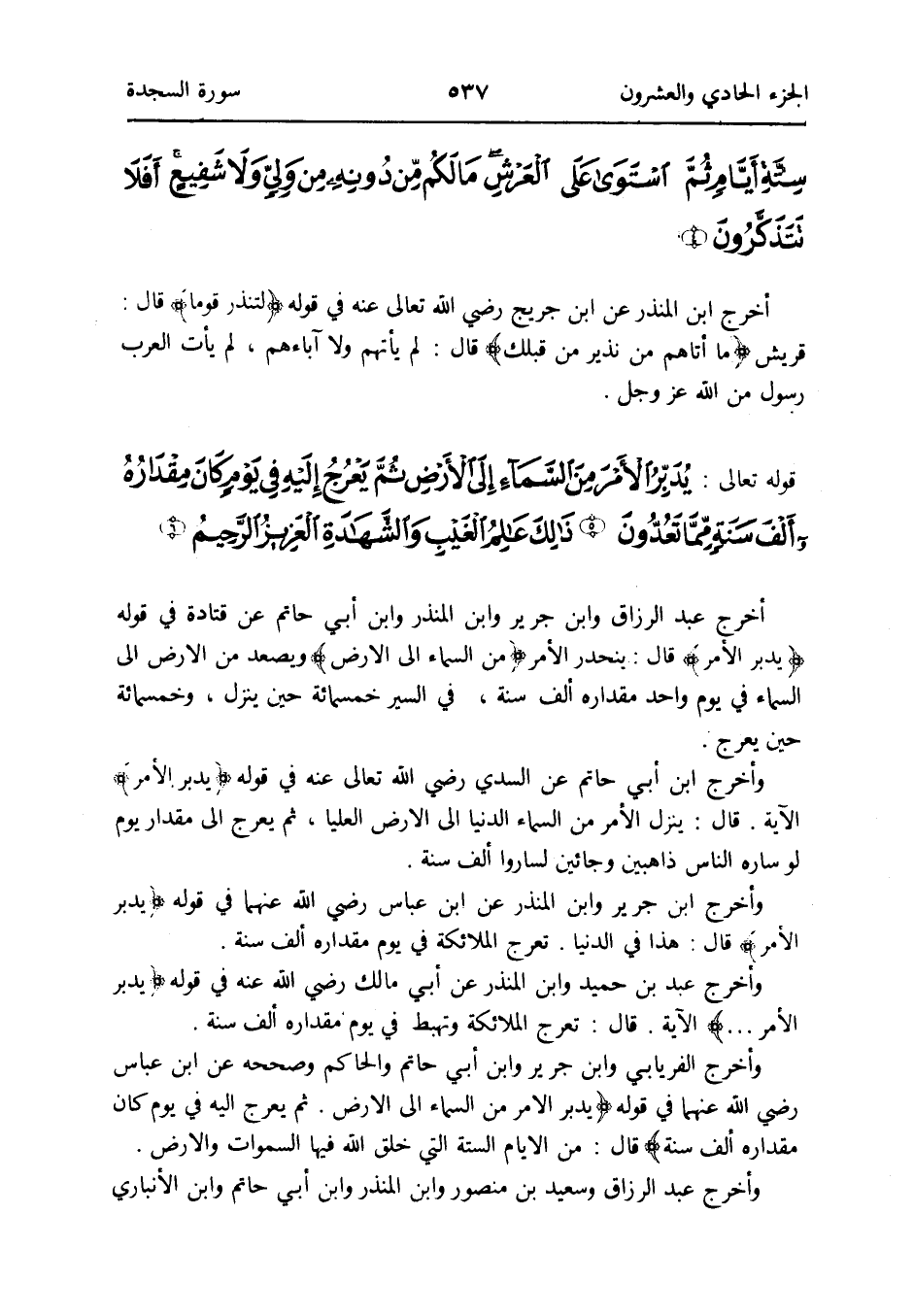 - قَوْله تَعَالَى: يدبر الْأَمر من السَّمَاء إِلَى الأَرْض ثمَّ يعرج إِلَيْهِ فِي يَوْم كَانَ مِقْدَاره ألف سنة مِمَّا تَعدونَ ذَلِك عَالم الْغَيْب وَالشَّهَادَة الْعَزِيز الرَّحِيم