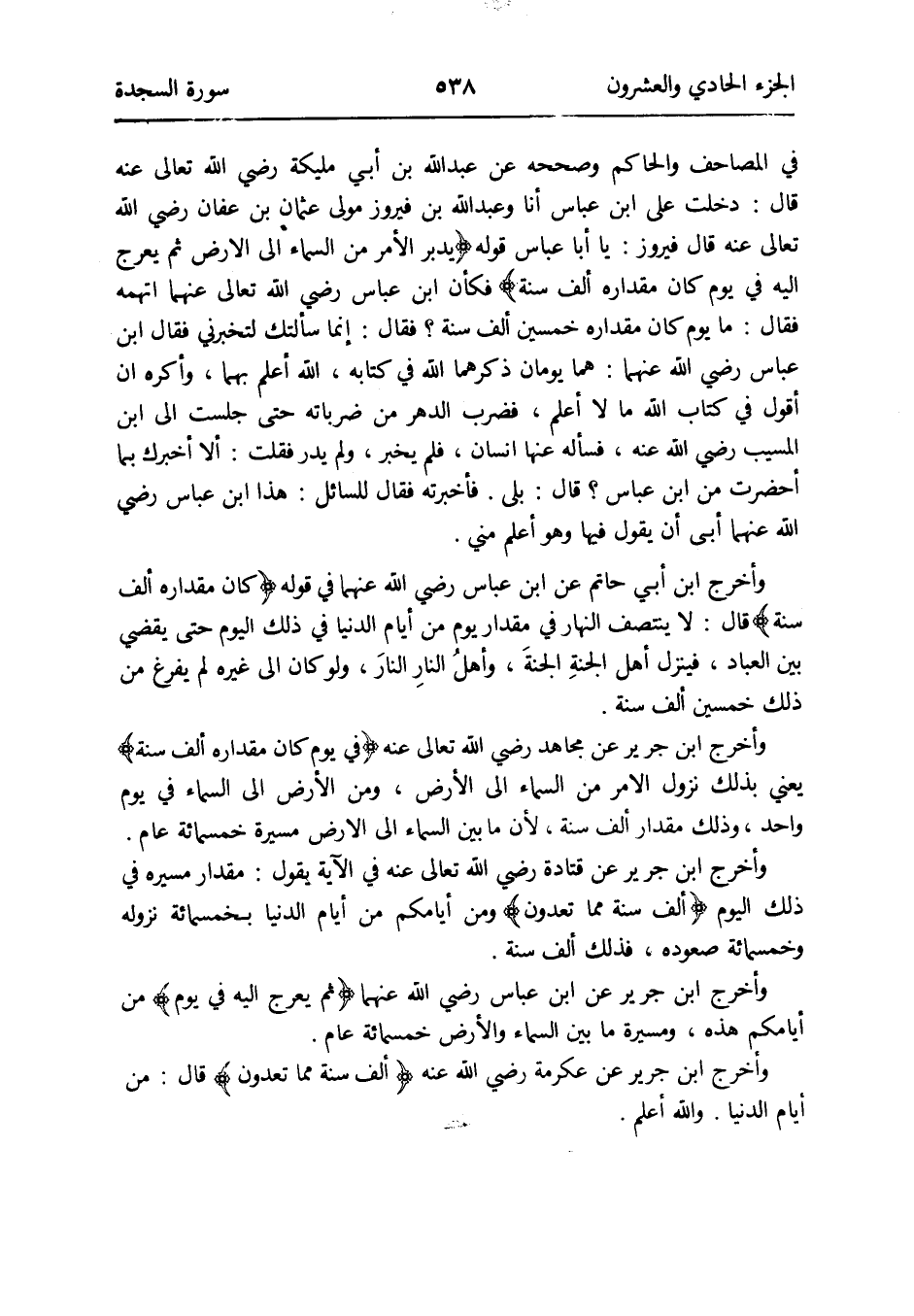 فِي الْمَصَاحِف وَالْحَاكِم وَصَححهُ عَن عبد الله بن أبي مليكَة رَضِي الله تَعَالَى عَنهُ قَالَ: دخلت على ابْن عَبَّاس أَنا وَعبد الله بن فَيْرُوز مولى عُثْمَان بن عَفَّان رَضِي الله تَعَالَى عَنهُ قَالَ فَيْرُوز: يَا أَبَا عَبَّاس قَوْله {يدبر الْأَمر من السَّمَاء إِلَى الأَرْض ثمَّ يعرج إِلَيْهِ فِي يَوْم كَانَ مِقْدَاره ألف سنة} فَكَأَن ابْن عَبَّاس رَضِي الله تَعَالَى عَنْهُمَا اتهمه فَقَالَ: مَا يَوْم كَانَ مِقْدَاره خمسين ألف سنة فَقَالَ: إِنَّمَا سَأَلتك لتخبرني فَقَالَ ابْن عَبَّاس رَضِي الله عَنْهُمَا: هما يَوْمَانِ ذكرهمَا الله فِي كِتَابه الله أعلم بهما وأكره أَن أَقُول فِي كتاب الله مَا لَا أعلم فَضرب الدَّهْر من ضرباته حَتَّى جَلَست إِلَى ابْن الْمسيب رَضِي الله عَنهُ فَسَأَلَهُ عَنْهَا انسان فَلم يخبر وَلم يدر فَقلت: أَلا أخْبرك بِمَا أحضرت من ابْن عَبَّاس قَالَ: بلَى