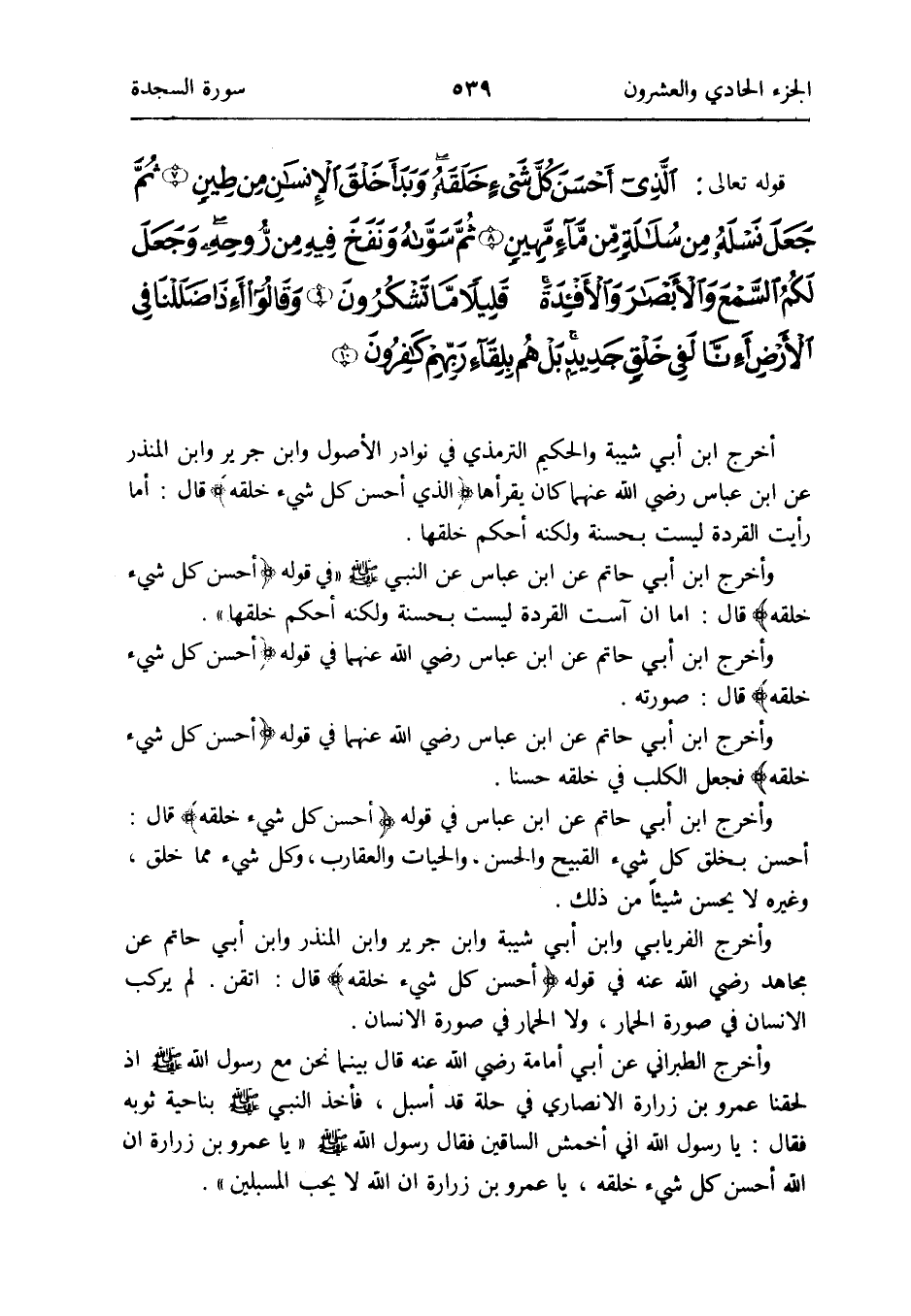 أخرج ابْن أبي شيبَة والحكيم التِّرْمِذِيّ فِي نَوَادِر الْأُصُول وَابْن جرير وَابْن الْمُنْذر عَن ابْن عَبَّاس رَضِي الله عَنْهُمَا كَانَ يَقْرَأها {الَّذِي أحسن كل شَيْء خلقه} قَالَ: أما رَأَيْت القردة لَيست بحسنة وَلكنه أحكم خلقهَا