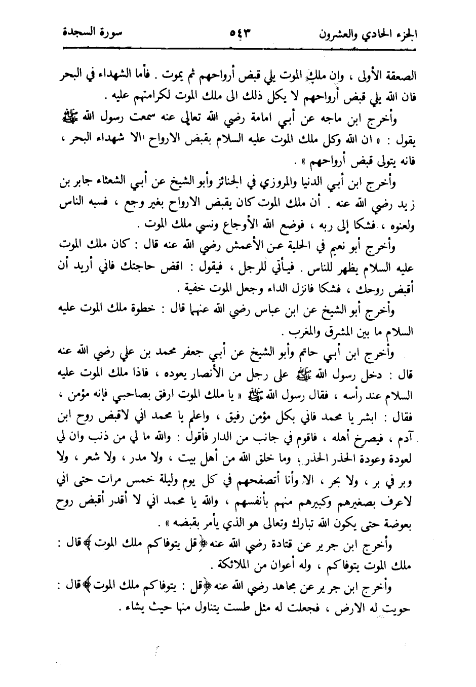 وَأخرج ابْن جرير عَن قَتَادَة رَضِي الله عَنهُ {قل يتوفاكم ملك الْمَوْت} قَالَ: ملك الْمَوْت يتوفاكم وَله أعوان من الْمَلَائِكَة