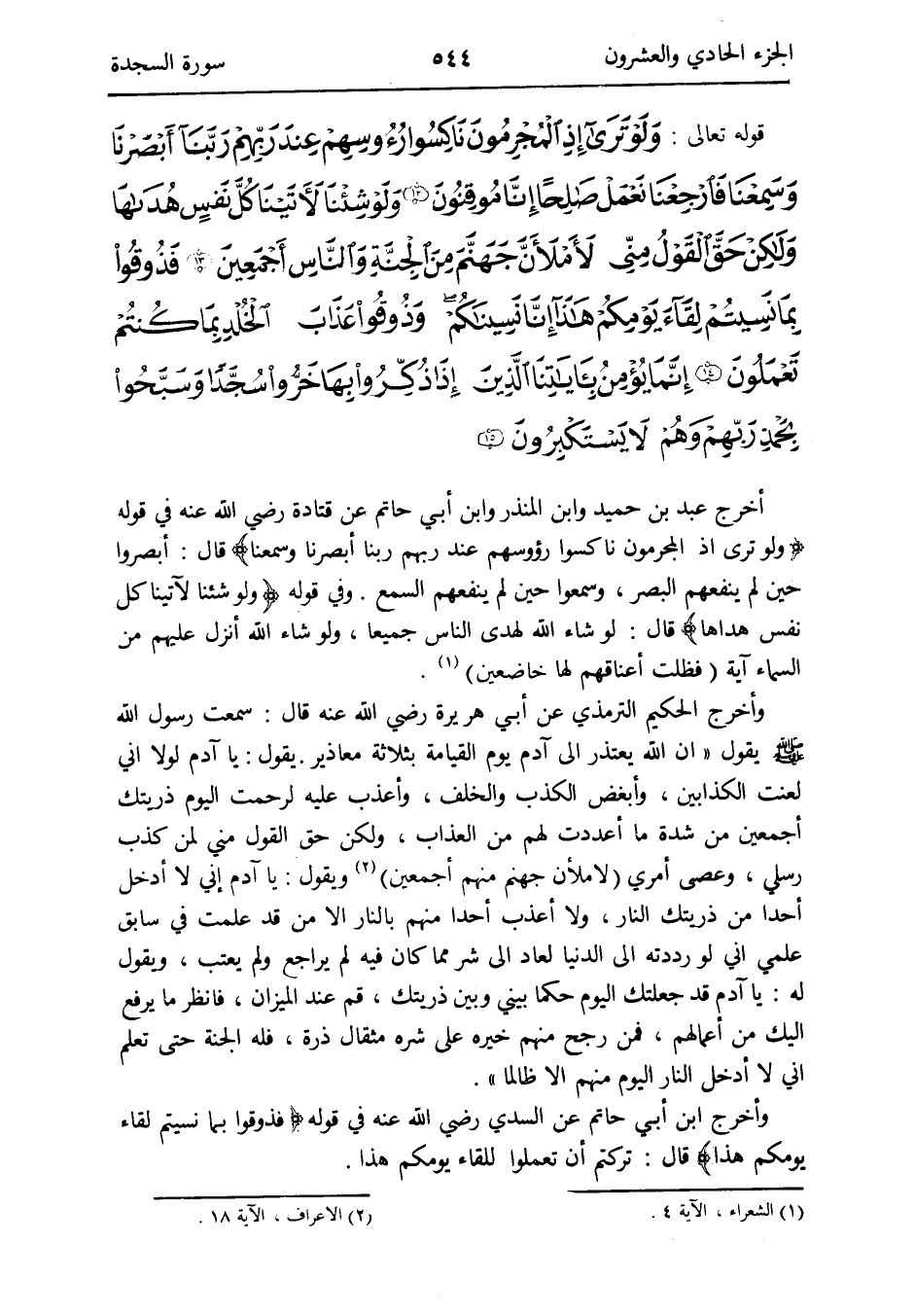 - قَوْله تَعَالَى: وَلَو ترى إِذْ المجرمون ناكسوا رؤوسهم عِنْد رَبهم رَبنَا أبصرنا وَسَمعنَا فارجعنا نعمل صَالحا انا موقنون وَلَو شِئْنَا لآتينا كل نفس هداها وَلَكِن حق القَوْل مني لأملأن جَهَنَّم من الْجنَّة وَالنَّاس أَجْمَعِينَ فَذُوقُوا بِمَا نسيتم لِقَاء يومكم هَذَا إِنَّا نسيناكم وذوقوا عَذَاب الْخلد بِمَا كُنْتُم تَعْمَلُونَ إِنَّمَا يُؤمن بِآيَاتِنَا الَّذين إِذا ذكرُوا بهَا خروا سجدا وسبحوا بِحَمْد رَبهم وهم لَا يَسْتَكْبِرُونَ