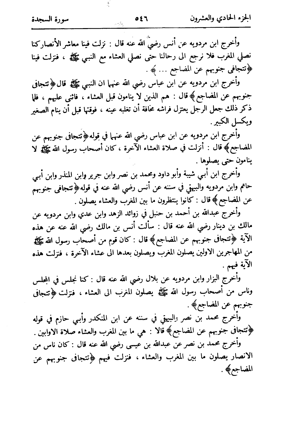 وَأخرج ابْن مرْدَوَيْه عَن ابْن عَبَّاس رَضِي الله عَنْهُمَا فِي قَوْله {تَتَجَافَى جنُوبهم عَن الْمضَاجِع} قَالَ: أنزلت فِي صَلَاة الْعشَاء الْآخِرَة كَانَ أَصْحَاب رَسُول الله صلى الله عَلَيْهِ وَسلم لَا ينامون حَتَّى يصلوها
