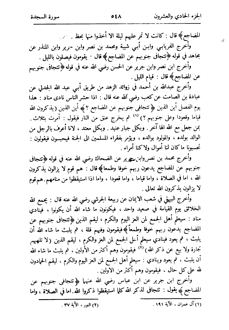 وَأخرج ابْن جرير عَن ابْن عَبَّاس رَضِي الله عَنْهُمَا {تَتَجَافَى جنُوبهم عَن الْمضَاجِع} يَقُول: تَتَجَافَى لذكر الله كلما استيقظوا ذكرُوا الله