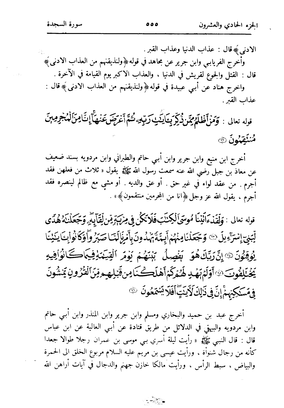 - قَوْله تَعَالَى: وَلَقَد آتَيْنَا مُوسَى الْكتاب فَلَا تكن فِي مرية من لِقَائِه وجعلناه هدى لبني إِسْرَائِيل وَجَعَلنَا مِنْهُم أَئِمَّة يهْدُونَ بأمرنا لما صَبَرُوا وَكَانُوا بِآيَاتِنَا يوقنون إِن رَبك هُوَ يفصل بَينهم يَوْم الْقِيَامَة فِيمَا كَانُوا فِيهِ يَخْتَلِفُونَ أولم يهد لَهُم كم أهلكنا من قبلهم من الْقُرُون يَمْشُونَ فِي مساكنهم إِن فِي ذَلِك لآيَات أَفلا يسمعُونَ