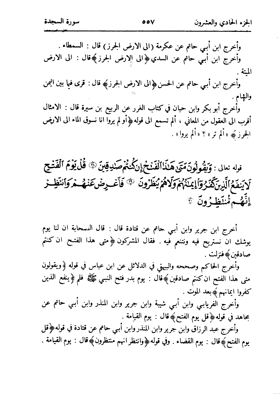 وَأخرج عبد الرَّزَّاق وَابْن جرير وَابْن الْمُنْذر وَابْن أبي حَاتِم عَن قَتَادَة فِي قَوْله {قل يَوْم الْفَتْح} قَالَ: يَوْم الْقَضَاء