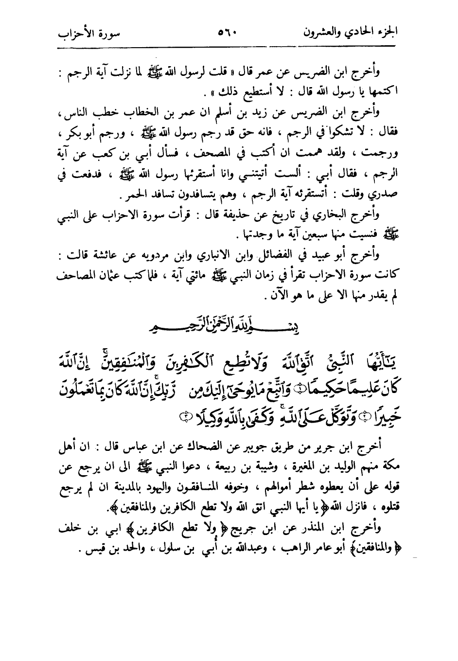- يَا أَيهَا النَّبِي اتَّقِ الله وَلَا تُطِع الْكَافرين وَالْمُنَافِقِينَ إِن الله كَانَ عليماً حكيماً وَاتبع مَا يُوحى إِلَيْك من رَبك إِن الله كَانَ بِمَا تَعْمَلُونَ خَبِيرا وتوكل على الله وَكفى بِاللَّه وَكيلا