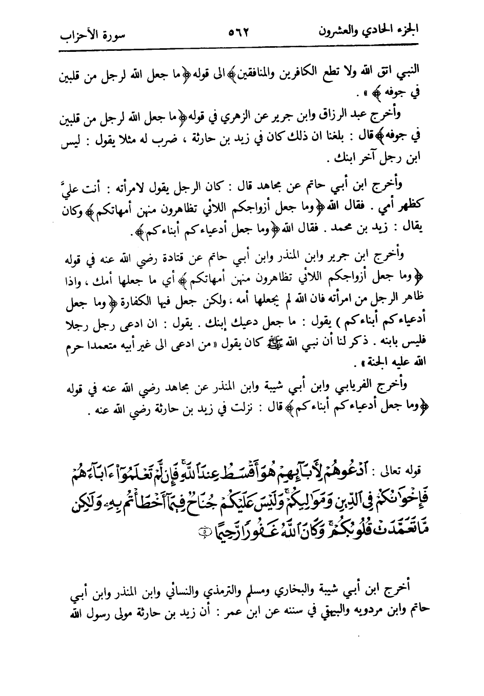 - قَوْله تَعَالَى: ادعوهُمْ لِآبَائِهِمْ هُوَ أقسط عِنْد الله فَإِن لم تعلمُوا آبَاءَهُم فاخوانكم فِي الدّين ومواليكم وَلَيْسَ عَلَيْكُم جنَاح فِيمَا أخطأتم بِهِ وَلكم مَا تَعَمّدت قُلُوبكُمْ وَكَانَ الله غَفُورًا رحِيما