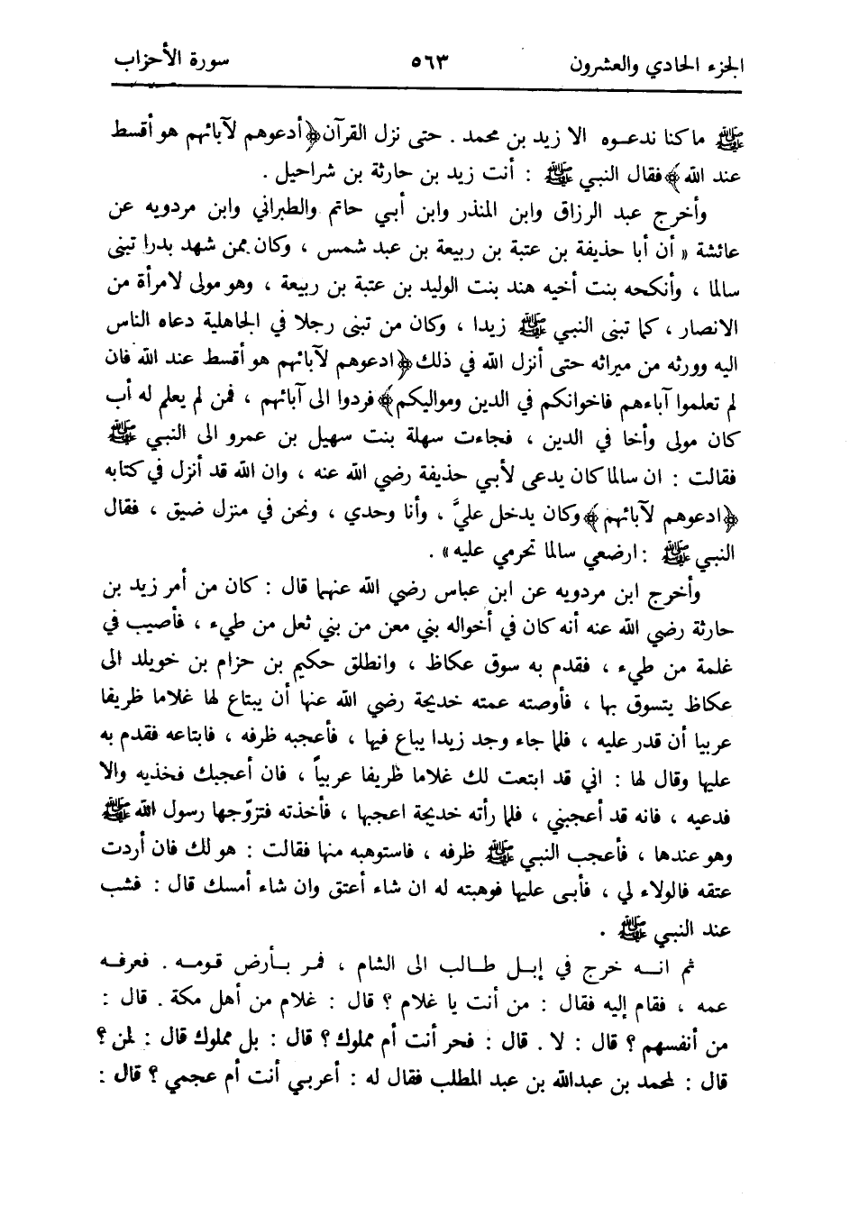وَأخرج عبد الرَّزَّاق وَابْن الْمُنْذر وَابْن أبي حَاتِم وَالطَّبَرَانِيّ وَابْن مرْدَوَيْه عَن عَائِشَة أَن أَبَا حُذَيْفَة بن عتبَة بن ربيعَة بن عتبَة بن عبد شمس وَكَانَ مِمَّن شهد بَدْرًا تبنى سالما وأنكحه بنت أَخِيه هِنْد بنت الْوَلِيد بن عتبَة بن ربيعَة وَهُوَ مولى لَا مرأة من الْأَنْصَار كَمَا تبنى النَّبِي صلى الله عَلَيْهِ وَسلم زيدا وَكَانَ من تبنى رجلا فِي الْجَاهِلِيَّة دَعَاهُ النَّاس إِلَيْهِ وَورثه من مِيرَاثه حَتَّى أنزل الله فِي ذَلِك {ادعوهُمْ لِآبَائِهِمْ هُوَ أقسط عِنْد الله فَإِن لم تعلمُوا آبَاءَهُم فإخوانكم فِي الدّين ومواليكم} فَردُّوا إِلَى آبَائِهِم فَمن لم يعلم لَهُ أَب كَانَ مولى وأخاً فِي الدّين فَجَاءَت سهلة بنت سُهَيْل بن عَمْرو إِلَى النَّبِي صلى الله عَلَيْهِ وَسلم فَقَالَت: إِن سالما كَانَ يدعى لأبي حُذَيْفَة رَضِي الله عَنهُ وَإِن الله قد أنزل فِي كِتَابه {ادعوهُمْ لِآبَائِهِمْ} وَكَانَ يدْخل عليَّ وَأَنا وحدي وَنحن فِي منزل ضيق فَقَالَ النَّبِي صلى الله عَلَيْهِ وَسلم: ارضعي سالما تحرمي عَلَيْهِ)