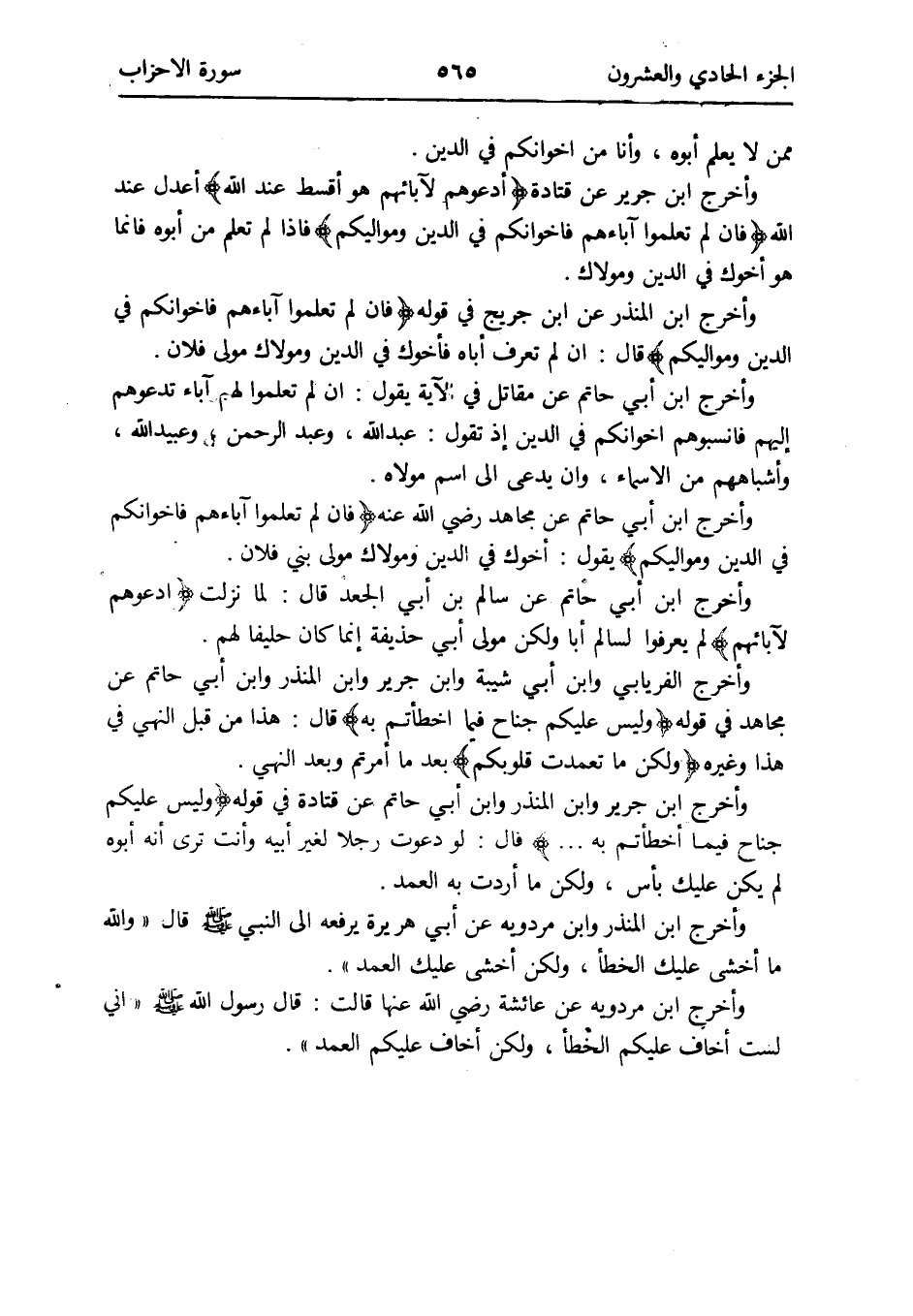 وَأخرج ابْن جرير عَن قَتَادَة {ادعوهُمْ لِآبَائِهِمْ هُوَ أقسط عِنْد الله} أعدل عِنْد الله {فَإِن لم تعلمُوا آبَاءَهُم فإخوانكم فِي الدّين ومواليكم} فَإِذا لم تعلم من أَبوهُ فَإِنَّمَا هُوَ أَخُوك فِي الدّين ومولاك