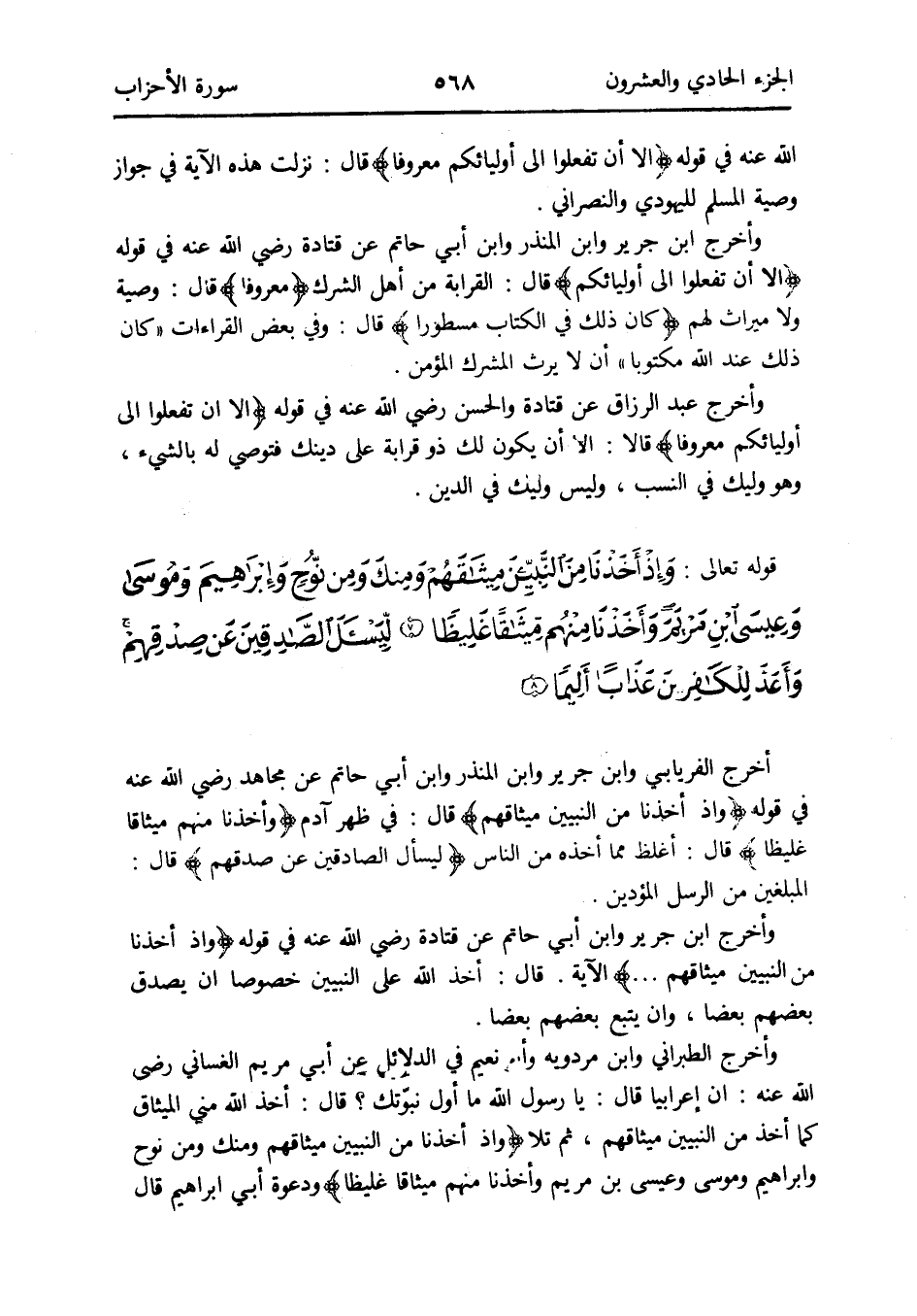 أخرج الْفرْيَابِيّ وَابْن جرير وَابْن الْمُنْذر وَابْن أبي حَاتِم عَن مُجَاهِد رَضِي الله عَنهُ فِي قَوْله {وَإِذ أَخذنَا من النَّبِيين ميثاقهم} قَالَ: فِي ظهر آدم {وأخذنا مِنْهُم ميثاقاً غليظاً} قَالَ: أغْلظ مِمَّا أَخذه من النَّاس {ليسأل الصَّادِقين عَن صدقهم} قَالَ: المبلغين من الرُّسُل المؤدين