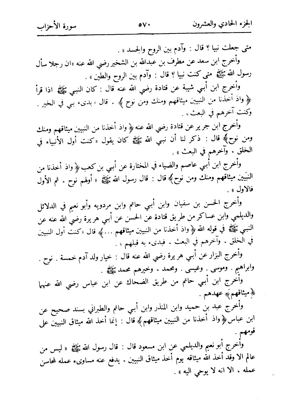 وَأخرج الْحسن بن سُفْيَان وَابْن أبي حَاتِم وَابْن مرْدَوَيْه وَأَبُو نعيم فِي الدَّلَائِل والديلمي وَابْن عَسَاكِر من طَرِيق قَتَادَة عَن الْحسن عَن أبي هُرَيْرَة رَضِي الله عَنهُ عَن النَّبِي صلى الله عَلَيْهِ وَسلم فِي قَوْله الله {وَإِذ أَخذنَا من النَّبِيين ميثاقهم} قَالَ كنت أول النَّبِيين فِي الْخلق وَآخرهمْ فِي الْبَعْث فبدىء بِهِ قبلهم