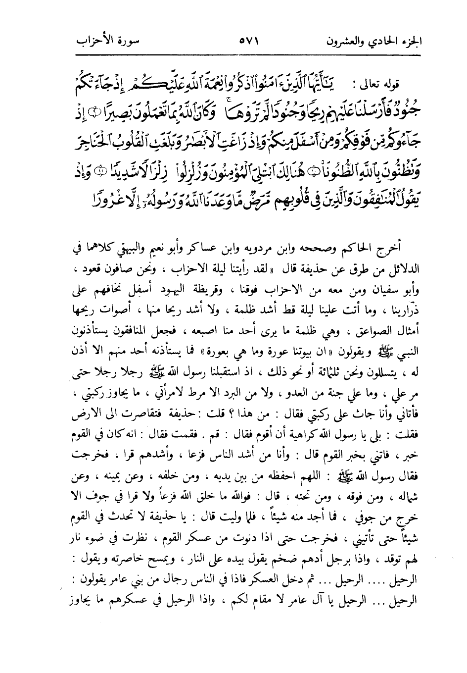 أخرج الْحَاكِم وَصَححهُ وَابْن مرْدَوَيْه وَابْن عَسَاكِر وَأَبُو نعيم وَالْبَيْهَقِيّ كِلَاهُمَا فِي الدَّلَائِل من طرق عَن حُذَيْفَة قَالَ لقد رَأَيْتنَا لَيْلَة الْأَحْزَاب وَنحن صافون قعُود وَأَبُو سُفْيَان وَمن مَعَه من الْأَحْزَاب فَوْقنَا وَقُرَيْظَة الْيَهُود أَسْفَل نخافهم على ذرارينا وَمَا أَتَت علينا لَيْلَة قطّ أَشد ظلمَة وَلَا أَشد ريحًا مِنْهَا أصوات رِيحهَا أَمْثَال الصَّوَاعِق وَهِي ظلمَة مَا يرى أحد منا اصبعه فَجعل المُنَافِقُونَ يستأذنون النَّبِي صلى الله عَلَيْهِ وَسلم وَيَقُولُونَ {إِن بُيُوتنَا عَورَة وَمَا هِيَ بِعَوْرَة} فَمَا يَسْتَأْذِنهُ أحد مِنْهُم إِلَّا أذن لَهُ يَتَسَلَّلُونَ وَنحن ثلثمِائة أَو نَحْو ذَلِك اذ استقبلنا رَسُول الله صلى الله عَلَيْهِ وَسلم رجلا رجلا حَتَّى مر عَليّ وَمَا عَليّ جنَّة من الْعَدو وَلَا من الْبرد إِلَّا مرط لامرأتي مَا يُجَاوز ركبتي فَأَتَانِي وَأَنا جاث على ركبتي فَقَالَ: من هَذَا قلت: حُذَيْفَة فتقاصرت إِلَى الأَرْض فَقلت: بلَى يَا رَسُول الله كَرَاهِيَة أَن أقوم فَقَالَ: قُم