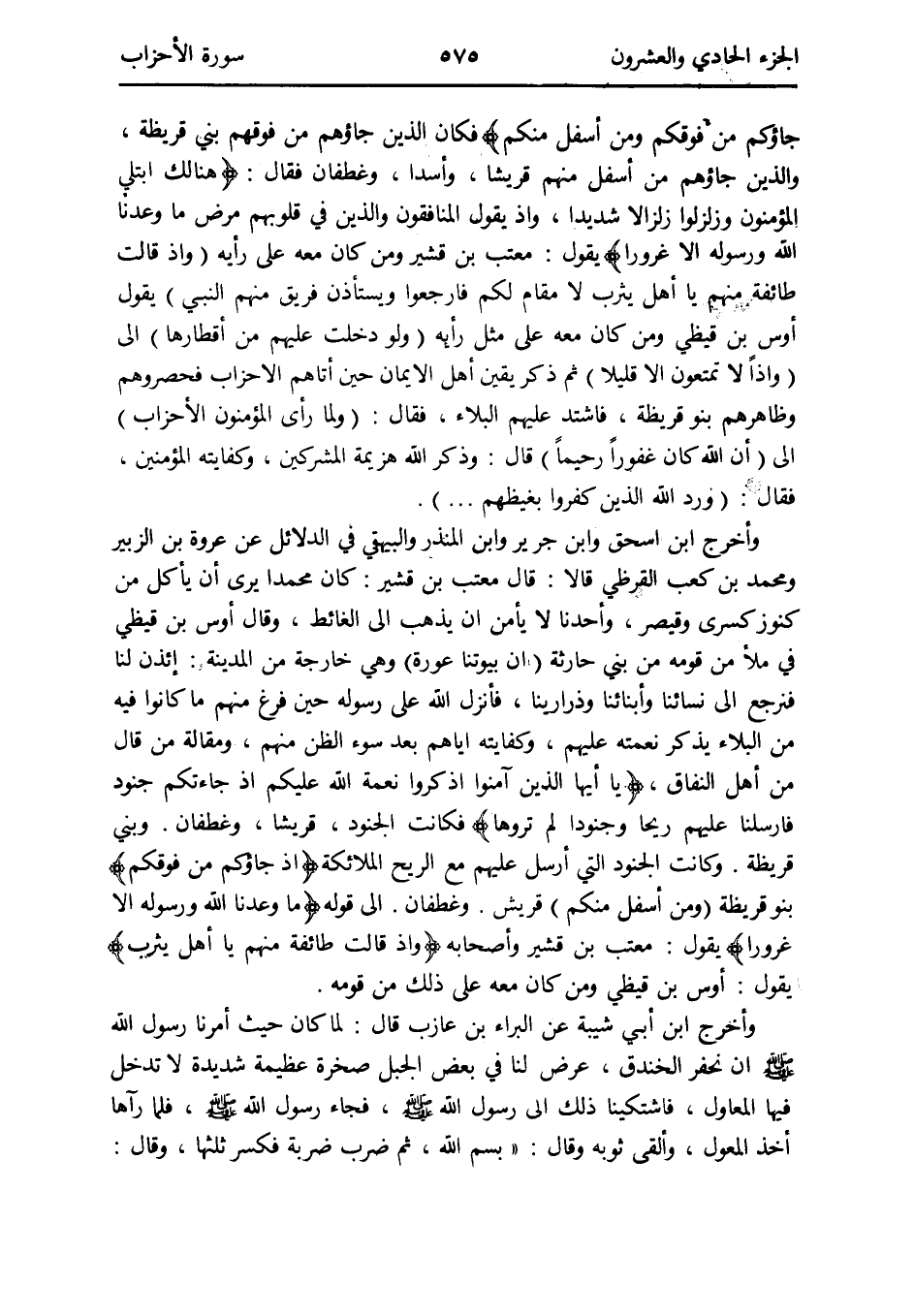 فَكَانَ الَّذين جاؤهم من فَوْقهم بني قُرَيْظَة وَالَّذين جاؤهم من أَسْفَل مِنْهُم قُريْشًا وأسداً وغَطَفَان فَقَالَ: {هُنَالك ابْتُلِيَ الْمُؤْمِنُونَ وزلزلوا زلزالاً شَدِيدا وَإِذ يَقُول المُنَافِقُونَ وَالَّذين فِي قُلُوبهم مرض مَا وعدنا الله وَرَسُوله إِلَّا غرُورًا} يَقُول: معتب بن قُشَيْر وَمن كَانَ مَعَه على رَأْيه {وَإِذ قَالَت طَائِفَة مِنْهُم يَا أهل يثرب لَا مقَام لكم فَارْجِعُوا ويستأذن فريق مِنْهُم النَّبِي} يَقُول أَوْس بن قيظي وَمن كَانَ مَعَه على مثل رَأْيه {وَلَو دخلت عَلَيْهِم من أقطارها} إِلَى {وَإِذا لَا تمتعون إِلَّا قَلِيلا} ثمَّ ذكر يَقِين أهل الايمان حِين أَتَاهُم الْأَحْزَاب فحصروهم وظاهرهم بَنو قُرَيْظَة فَاشْتَدَّ عَلَيْهِم الْبلَاء فَقَالَ: {وَلما رأى الْمُؤْمِنُونَ الْأَحْزَاب} إِلَى {إِن الله كَانَ غَفُورًا رحِيما} قَالَ: وَذكر الله هزيمَة الْمُشْركين وكفايته الْمُؤمنِينَ فَقَالَ: {ورد الله الَّذين كفرُوا بغيظهم}