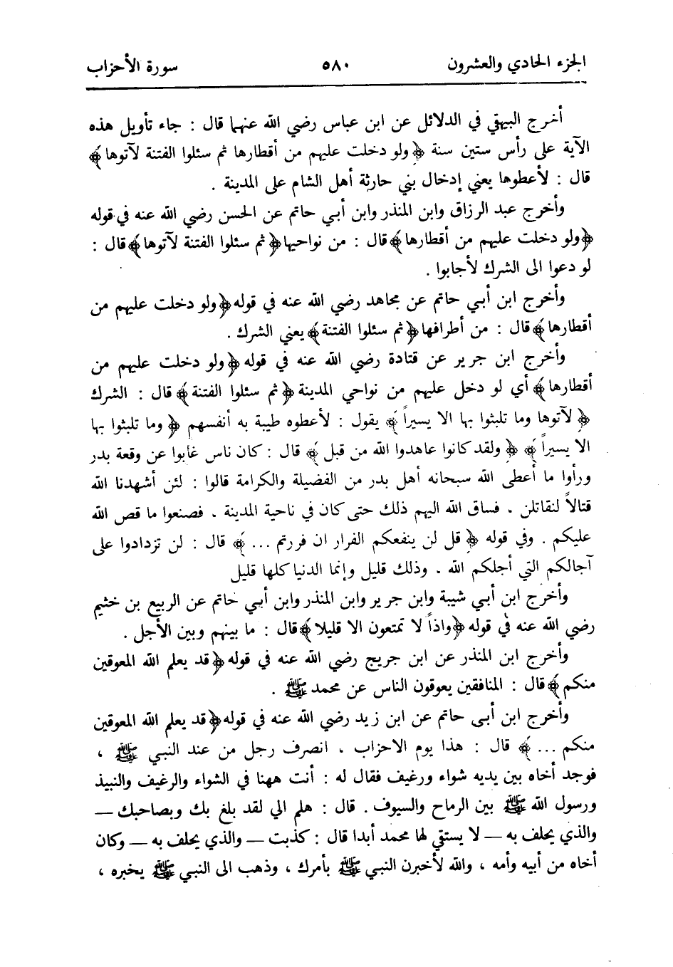 وَأخرج ابْن جرير عَن قَتَادَة رَضِي الله عَنهُ فِي قَوْله {وَلَو دخلت عَلَيْهِم من أقطارها} أَي لَو دخل عَلَيْهِم من نواحي الْمَدِينَة {ثمَّ سئلوا الْفِتْنَة} قَالَ: الشّرك {لآتوها وَمَا تلبثوا بهَا إِلَّا يَسِيرا} يَقُول: لأعطوه طيبَة بِهِ أنفسهم {وَمَا تلبثوا بهَا إِلَّا يَسِيرا} {وَلَقَد كَانُوا عَاهَدُوا الله من قبل} قَالَ: كَانَ نَاس غَابُوا عَن وقْعَة بدر وَرَأَوا مَا أعْطى الله سُبْحَانَهُ أهل بدر من الْفَضِيلَة والكرامة قَالُوا: لَئِن أشهدنا الله قتالاً لنقاتلن فساق الله إِلَيْهِم ذَلِك حَتَّى كَانَ فِي نَاحيَة الْمَدِينَة فصنعوا مَا قصّ الله عَلَيْكُم