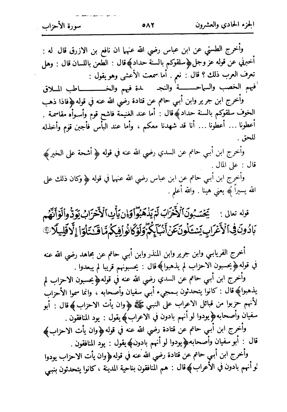 - يحسبون الْأَحْزَاب لم يذهبوا وَإِن يَأْتِ الْأَحْزَاب يودوا لَو أَنهم بادون فِي الْأَعْرَاب يسئلون عَن أنبائكم وَلَو كَانُوا فِيكُم مَا قَاتلُوا إِلَّا قَلِيلا أخرج الْفرْيَابِيّ وَابْن جرير وَابْن الْمُنْذر وَابْن أبي حَاتِم عَن مُجَاهِد رَضِي الله عَنهُ فِي قَوْله يحسبون الْأَحْزَاب لم يذهبوا قَالَ يحسبونهم قَرِيبا لم يبعدوا وَأخرج ابْن أبي حَاتِم عَن السّديّ رَضِي الله عَنهُ فِي قَوْله يحسبون الْأَحْزَاب لم يذهبوا قَالَ كَانُوا يتحدثون بمجيء أبي سُفْيَان وَأَصْحَابه وَإِنَّمَا سموا الْأَحْزَاب لأَنهم حزبوا من قبائل الْأَعْرَاب على النَّبِي صلى الله علييه وَسلم {وَإِن يَأْتِي الْأَحْزَاب} قَالَ أَبُو سُفْيَان وَأَصْحَابه {يودوا لَو أَنهم بادون فِي الْأَعْرَاب} يَقُول يود المُنَافِقُونَ وَأخرج ابْن أبي حَاتِم عَن قَتَادَة رَضِي الله عَنهُ قي قَوْله {وَإِن يَأْتِ الْأَحْزَاب} قَالَ أَبُو سُفْيَان وَأَصْحَابه {يودوا لَو أَنهم بادون} يَقُول يود المنافقيون وَأخرج ابْن أبي حَاتِم عَن قَتَادَة رَضِي الله عَنهُ فِي قَوْله وَإِن يَأْتِ الْأَحْزَاب {يودوا لَو أَنهم بادون فِي الْأَعْرَاب} قَالَ هم المُنَافِقُونَ بِنَاحِيَة الْمَدِينَة كَانُوا يتحدثون بِنَبِي