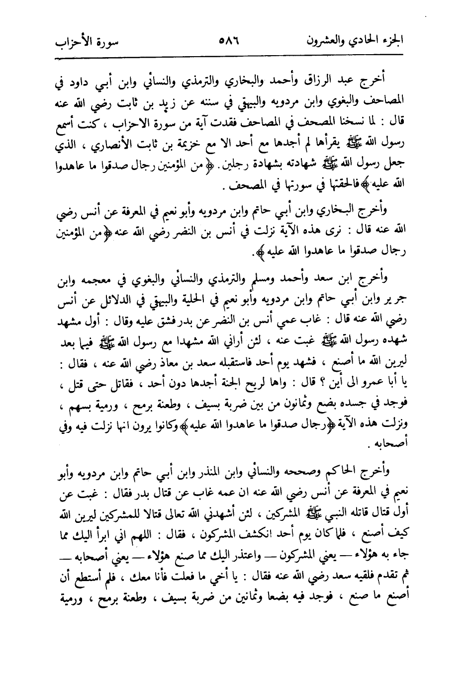 أخرج عبد الرَّزَّاق وَأحمد وَالْبُخَارِيّ وَالتِّرْمِذِيّ وَالنَّسَائِيّ وَابْن أبي دَاوُد فِي الْمَصَاحِف وَالْبَغوِيّ وَابْن مرْدَوَيْه وَالْبَيْهَقِيّ فِي سنَنه عَن زيد بن ثَابت رَضِي الله عَنهُ قَالَ لما نسخنا الْمُصحف فِي الْمَصَاحِف فقدت آيَة من سُورَة الْأَحْزَاب كنت أسمع رَسُول الله صلى الله عَلَيْهِ وَسلم يَقْرَأها لم أَجدهَا مَعَ أحد إِلَّا مَعَ خُزَيْمَة بن ثَابت الْأنْصَارِيّ الَّذِي جعل رَسُول الله صلى الله عَلَيْهِ وَسلم شَهَادَته بِشَهَادَة رجلَيْنِ {من الْمُؤمنِينَ رجال صدقُوا مَا عَاهَدُوا الله عَلَيْهِ} فَأَلْحَقْتهَا فِي سورتها فِي الْمُصحف وَأخرج البُخَارِيّ وَابْن أبي حَاتِم وَابْن مرْدَوَيْه وَأَبُو نعيم فِي الْمعرفَة عَن أنس رَضِي الله عَنهُ قَالَ نرى هَذِه الْآيَة نزلت فِي أنس بن النَّضر رَضِي الله عَنهُ {من الْمُؤمنِينَ رجال صدقُوا مَا عَاهَدُوا الله عَلَيْهِ} وَأخرج ابْن سعد وَأحمد وَمُسلم وَالتِّرْمِذِيّ وَالنَّسَائِيّ وَالْبَغوِيّ فِي مُعْجَمه وَابْن جرير وَابْن أبي حَاتِم وَابْن مرْدَوَيْه وَأَبُو نعيم فِي الْحِلْية والبيقي فِي الدَّلَائِل عَن أنس رَضِي الله عَنهُ قَالَ غَابَ عمي أنس بن النَّضر عَن بدر فشق عَلَيْهِ وَقَالَ أول مشْهد شهده رَسُول الله صلى الله عَلَيْهِ وَسلم غبت عَنهُ لَئِن أَرَانِي الله مشهدا مَعَ رَسُول الله صلى الله عَلَيْهِ وَسلم فِيمَا بعد ليرين الله مَا أصنع فَشهد يَوْم أحد فَاسْتَقْبلهُ سعد بن معَاذ رَضِي الله عَنهُ فَقَالَ يَا أَبَا عَمْرو إِلَى لَا أَيْن قَالَ واهاً لريح الْجنَّة أَجدهَا دون أحد فقاتل حَتَّى قتل فَوجدَ فِي جسده بضع وَثَمَانُونَ من بَين ضَرْبَة بِسيف وطعنة بِرُمْح ورمية بِسَهْم وَنزلت هَذِه الْآيَة {رجال صدقُوا مَا عَاهَدُوا الله عَلَيْهِ} وَكَانُوا يرَوْنَ أَنَّهَا نزلت فِيهِ وَفِي أَصْحَابه وَأخرج الْحَاكِم وَصَححهُ وَالنَّسَائِيّ وَابْن الْمُنْذر وَابْن أبي حَاتِم وَابْن مرْدَوَيْه وَأَبُو نعيم فِي الْمعرفَة عَن أنس رَضِي الله عَنهُ أَن عَمه غَابَ عَن قتال بدر فَقَالَ غبت عَن أول قتال قَاتله النَّبِي صلى الله عَلَيْهِ وَسلم الْمُشْركين لَئِن أشهدني الله تَعَالَى قتالاً للْمُشْرِكين ليرين الله كَيفَ أصنع فَلَمَّا كَانَ يَوْم أحد انْكَشَفَ الْمُشْركُونَ فَقَالَ اللَّهُمَّ إِنِّي ابرأ إِلَيْك مِمَّا جَاءَ بِهِ هَؤُلَاءِ يَعْنِي الْمُشْركُونَ وَاعْتذر إِلَيْك مِمَّا صنع هَؤُلَاءِ عَنى أَصْحَابه ثمَّ تقدم فَلَقِيَهُ سعد رَضِي الله عَنهُ فَقَالَ يَا أخي مَا فعلق فَأَنا مَعَك فَلم أستطع أَن أصنع مَا صنع فَوجدَ فِيهِ بضعاً وَثَمَانِينَ من ضَرْبَة بِسيف وطعنة بِرُمْح ورمية