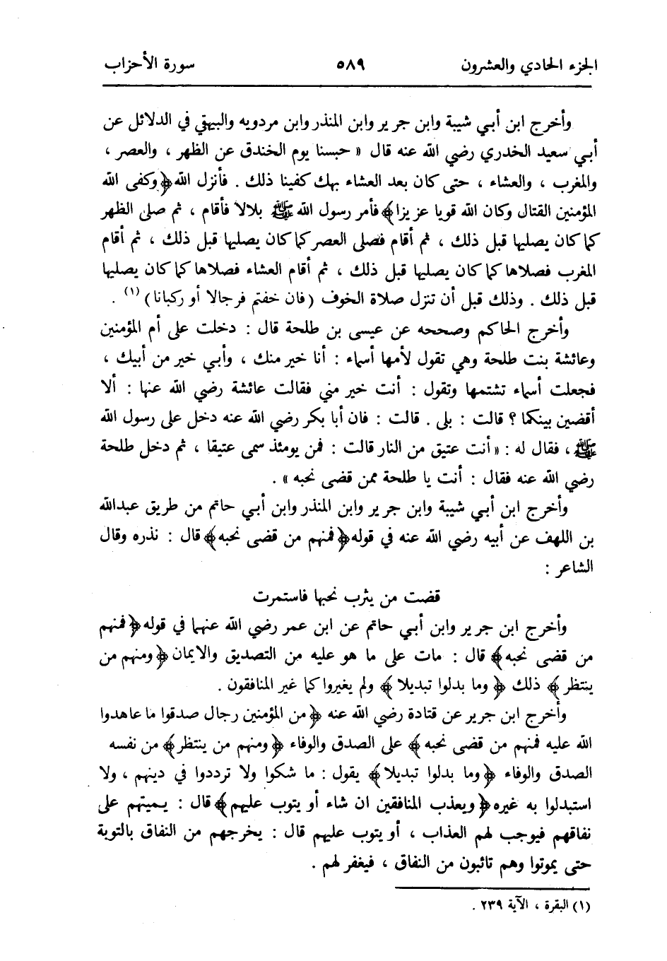 وَأخرج ابْن أبي شيبَة وَابْن جرير وَابْن الْمُنْذر وَابْن أبي حَاتِم من طَرِيق عبد الله بن اللهف عَن أَبِيه رَضِي الله عَنهُ فِي قَوْله {فَمنهمْ من قضى نحبه} قَالَ: نَذره وَقَالَ الشَّاعِر: قَضَت من يثرب نحبها فاستمرت وَأخرج ابْن جرير وَابْن أبي حَاتِم عَن ابْن عمر رَضِي الله عَنْهُمَا فِي قَوْله {فَمنهمْ من قضى نحبه} قَالَ: مَاتَ على مَا هُوَ عَلَيْهِ من التَّصْدِيق والإِيمان {وَمِنْهُم من ينْتَظر} ذَلِك {وَمَا بدلُوا تبديلاً} وَلم يُغيرُوا كَمَا غير المُنَافِقُونَ