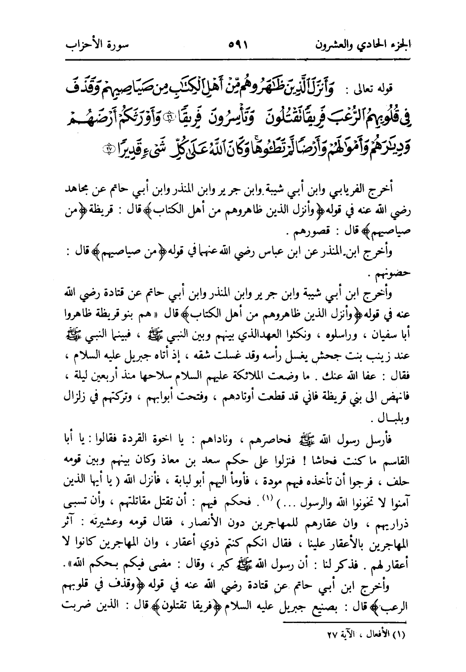 - وَأنزل الَّذين ظاهروهم من أهل الْكتاب من صياصيهم وَقذف فِي قُلُوبهم الرعب فريقا تقتلون وتأسرون فريق وأورثكم أَرضهم وديارهم وَأَمْوَالهمْ وأرضا لم تطؤها وَكَانَ الله على كل شَيْء قَدِيرًا أخرج الْفرْيَابِيّ وَابْن أبي شيبَة وَابْن جرير وَابْن الْمُنْذر وَابْن أبي حَاتِم عَن مُجَاهِد رَضِي الله عَنهُ فِي قَوْله {وَأنزل الَّذين ظاهروهم من أهل الْكتاب} قَالَ قُرَيْظَة {من صياصيهم} قَالَ قصورهم وَأخرج ابْن الْمُنْذر عَن ابْن عَبَّاس ضي الله عَنْهُمَا فِي قَوْله {من صياصيهم} قَالَ حصونهم وَأخرج ابْن أبي شيبَة وَابْن جرير وَابْن الْمُنْذر وَابْن أبي حَاتِم عَن قَتَادَة رَضِي الله عَنهُ فِي قَوْله {وَأنزل الَّذين ظاهروهم من أهل الْكتاب} قَالَ هم بَنو قُرَيْظَة ظاهروا أَبَا سُفْيَان وراسلوه وَنَكَثُوا الْعَهْد الَّذِي بَينهم وَبَين النَّبِي صلى الله عَلَيْهِ وَسلم فَبَيْنَمَا النَّبِي صلى الله عَلَيْهِ وَسلم عِنْد زَيْنَب بنت جحش يغسل رَأسه وَقد غسلت شقَّه إِذْ أَتَاهُ جِبْرِيل عَلَيْهِ السَّلَام فَقَالَ عَفا الله عَنْك مَا وضعت الْمَلَائِكَة عَلَيْهِم السَّلَام سلاحها مُنْذُ أَرْبَعِينَ لَيْلَة فانهض إِلَى بني قُرَيْظَة فَإِنِّي قد قطعت أوتادهم وَفتحت أَبْوَابهم وتركتهم فِي زلزال وبلبال فَأرْسل رَسُول الله صلى الله عَلَيْهِ وَسلم فَحَاصَرَهُمْ وناداهم يَا اخوة القردة فَقَالُوا يَا أَبَا الْقَاسِم مَا كنت فحاشاً فنزلوا على حكم سعد بن معَاذ وَكَانَ بَينهم وَبَين قومه حلف فَرجوا أَن تَأْخُذهُ فيهم مَوَدَّة فَأَوْمأ إِلَيْهِم أَبُو لبَابَة فَأنْزل الله {يَا أَيهَا الَّذين آمنُوا لَا تخونوا الله وَالرَّسُول} فَحكم فيهم أَن تقتل مُقَاتلَتهمْ وَأَن تسبى ذَرَارِيهمْ وَأَن عقارهم للمهاجرين دون الْأَنْصَار فَقَالَ قومه وعشيرته آثر الْمُهَاجِرين بالأعقار علينا فَقَالَ إِنَّكُم كُنْتُم ذَوي أعقار وَأَن الْمُهَاجِرين كَانُوا لَا أعقار لَهُم فَذكر لنا أَن رَسُول الله صلى الله عَلَيْهِ كبر وَقَالَ مضى فِيكُم بِحكم الله وَأخرج ابْن أبي حَاتِم عَن قَتَادَة رَضِي الله عَنهُ فِي قَوْله {وَقذف فِي قُلُوبهم الرعب} قَالَ بصنيع جِبْرِيل عَلَيْهِ السَّلَام {فريقاً تقتلون} قَالَ الَّذين ضربت