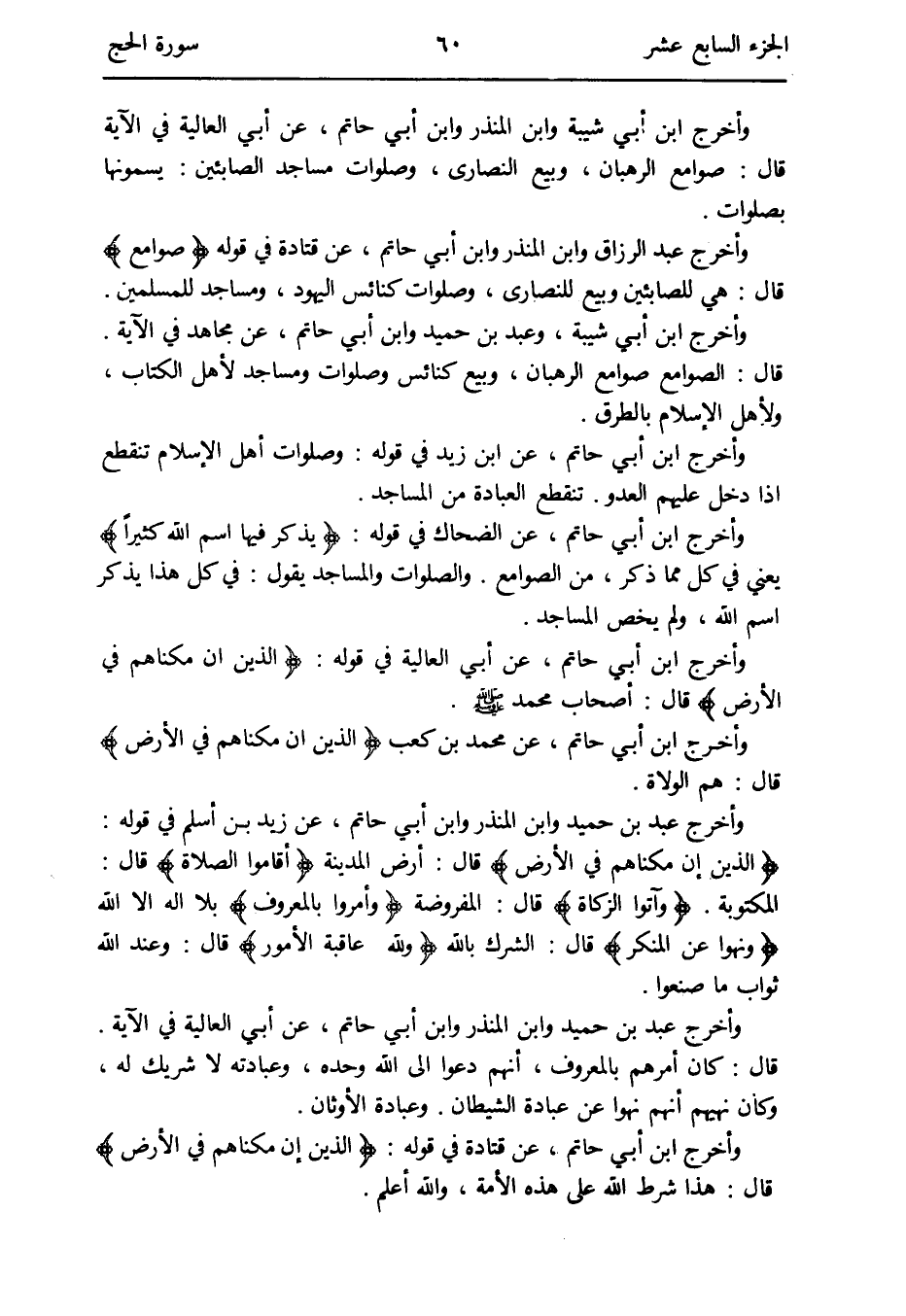 وَأخرج ابْن أبي حَاتِم عَن قَتَادَة فِي قَوْله: {الَّذين إِن مكناهم فِي الأَرْض} قَالَ: هَذَا شَرط الله على هَذِه الْأمة وَالله أعلم