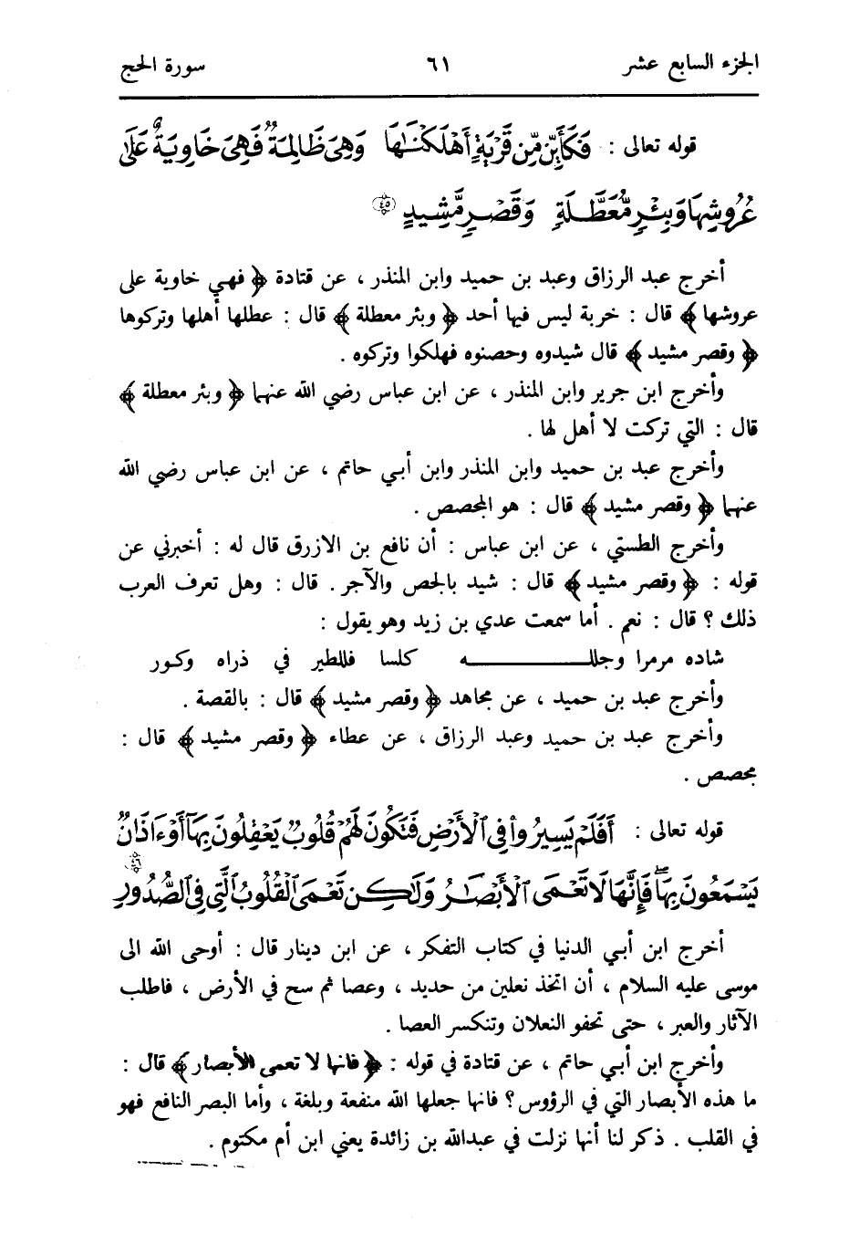 أخرج عبد الرَّزَّاق وَعبد بن حميد وَابْن الْمُنْذر عَن قَتَادَة {فَهِيَ خاوية على عروشها} قَالَ: خربة لَيْسَ فها أحد {وبئر معطلة} قَالَ: عطلها أَهلهَا وتركوها {وَقصر مشيد} قَالَ شيدوه وحصنوه فهلكوا وتركوه